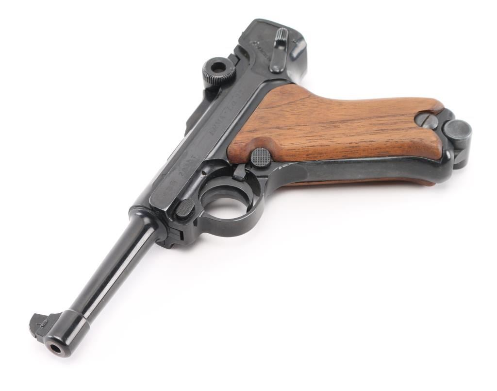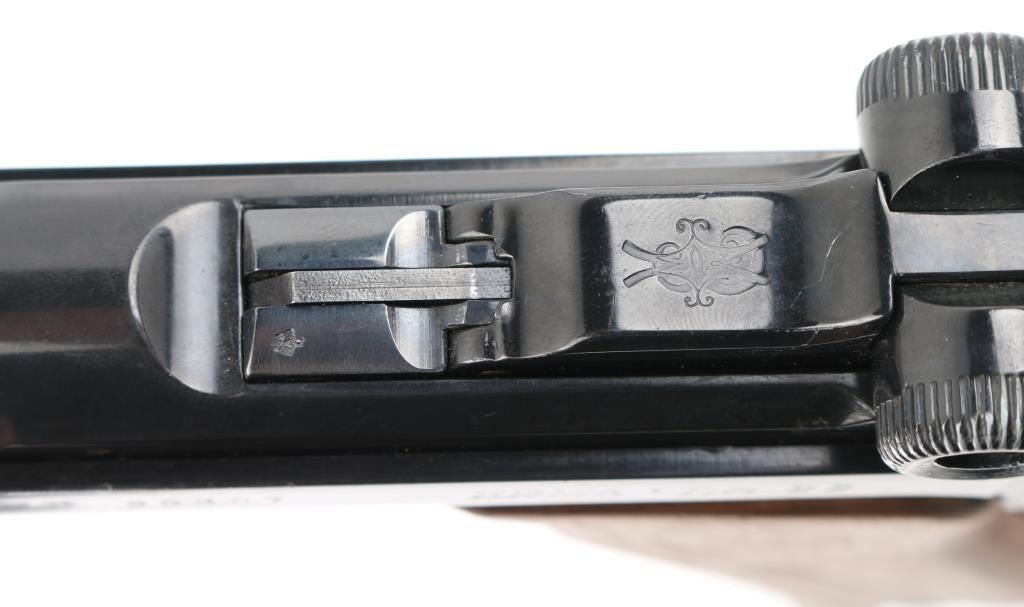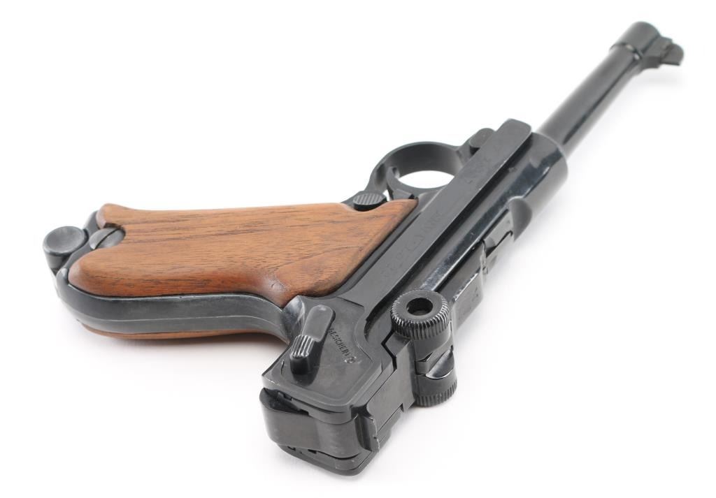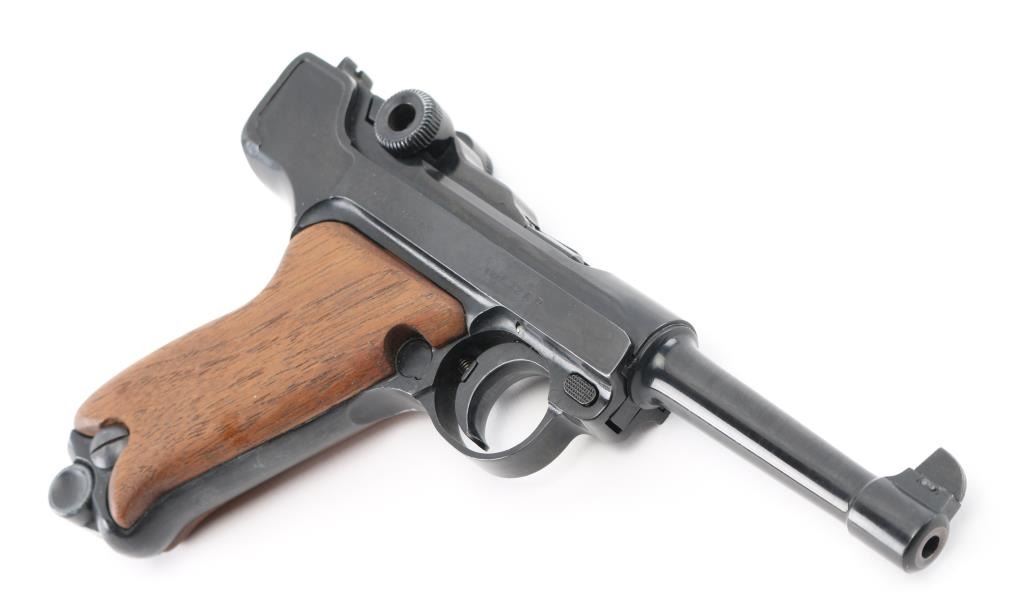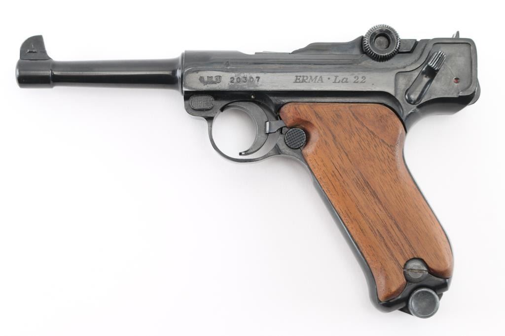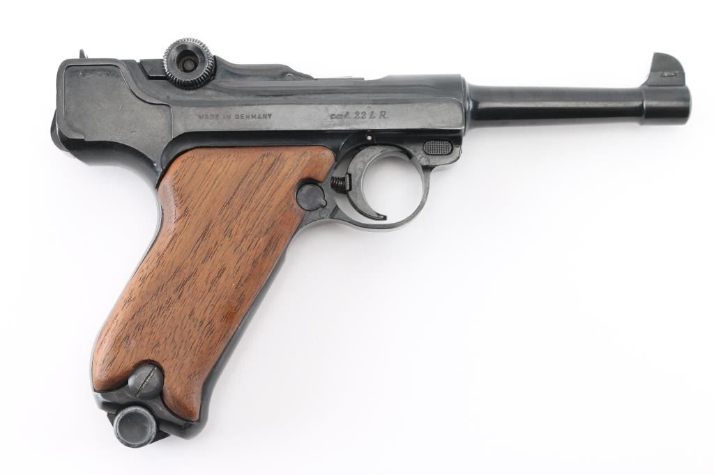 German made semi auto pistol in the Luger style, chambered for .22LR ammunition, circa 1965. Blued finish, smooth wood grips, 4.5" barrel, good bore, fixed sights, and one magazine. Safety works but is not functioning properly, have it looked at before using. Condition is NRA Fair *C&R Firearm*