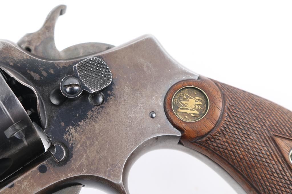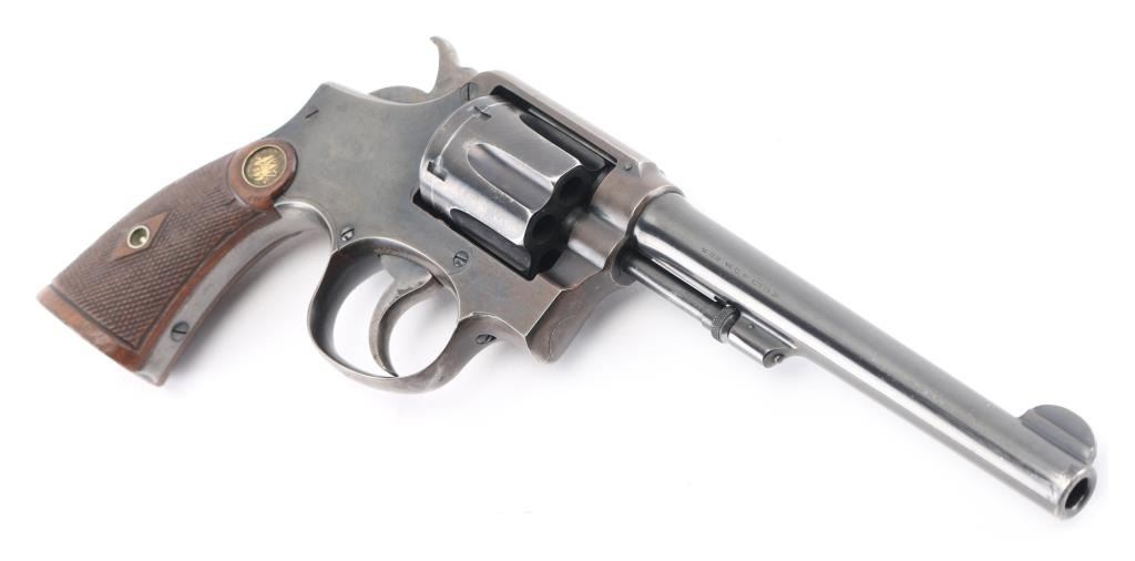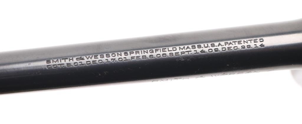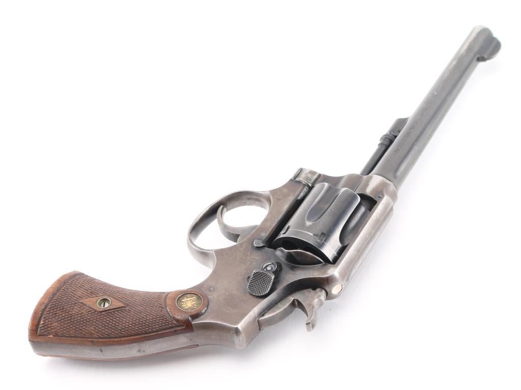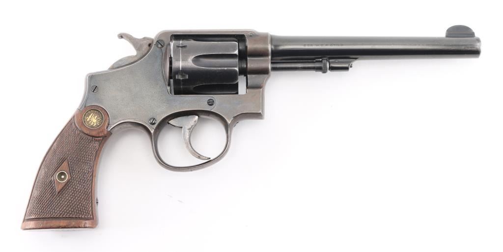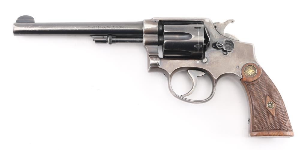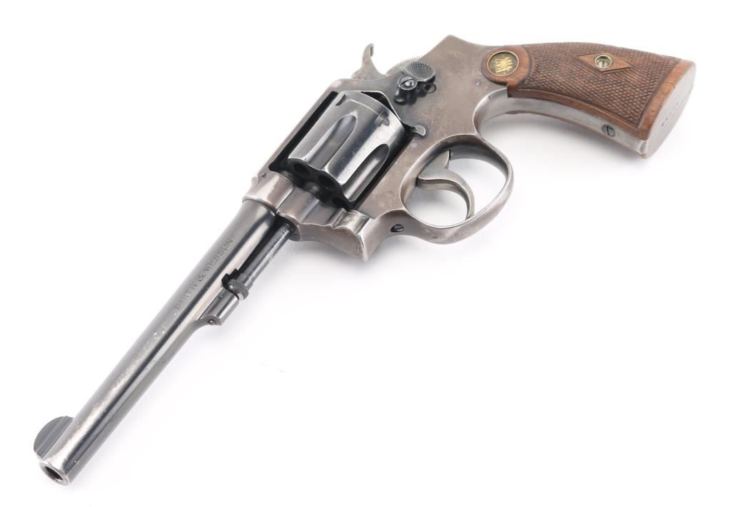 'Model of 1905, 4th Change' Vintage medium frame double action revolver chambered in .32-20 Winchester, manufactured in Springfield, MA circa 1915-1940. Features a blued finish, pinned 6" round tapered barrel, forged round blade front sight, 'u' notched rear sight, non-shrouded ejector rod, fluted six-shot swing-out cylinder, smooth .265" case hardened trigger, case hardened .265" hammer with knurled spur, five screw square butt K service frame and diamond checkered walnut grips with brass S&W medallions. Matching serial numbers are observed on the frame, barrel, cylinder and extractor star. Revolver exhibits approximately 40% bluing with the barrel and cylinder retaining the majority of the finish, the frame showing major finish loss and the sideplate appearing to be a replacement with pin prick pitting throughout. Action is mechanically sound with good lock-up, the bore is excellent, the markings are crisp and the wood grips are good with wear. Condition is near NRA Good. ***Modern Firearm*** ***C&R Eligible***