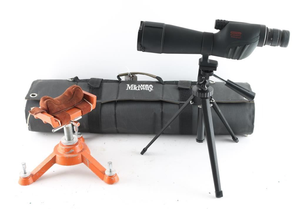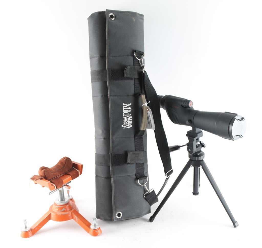 includes #1) MidwayUSA roll up mat in good or better condition. #2) Redfield Rampage 20-60x60mm spotting scope with tripod and carry bag, all very good condition. #3) Hoppes tripod rest with small bag, very good condition.
