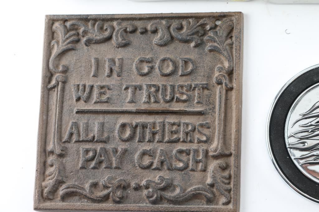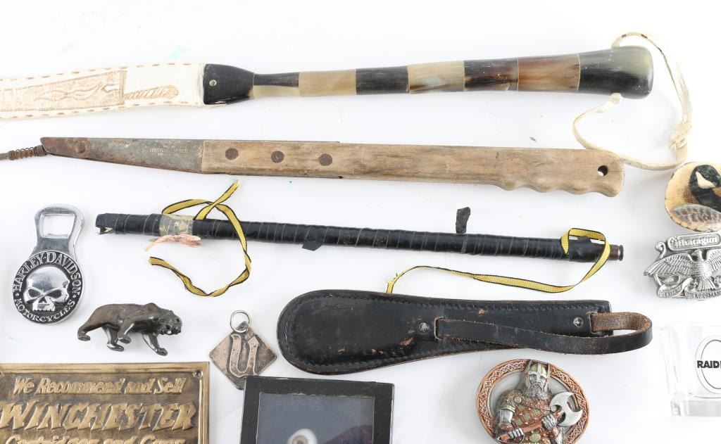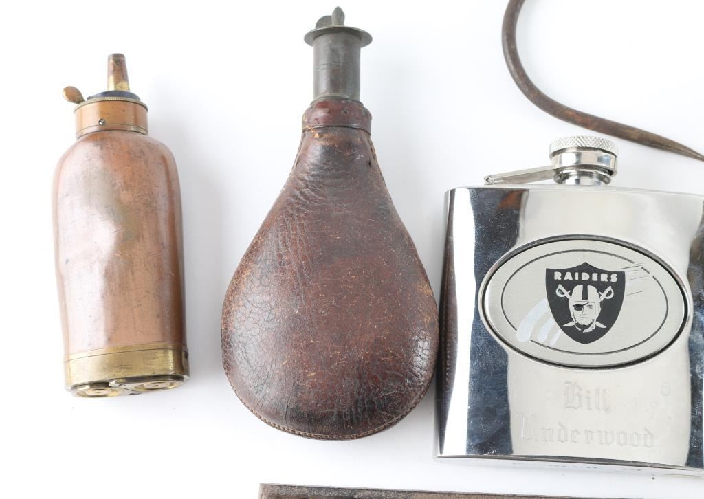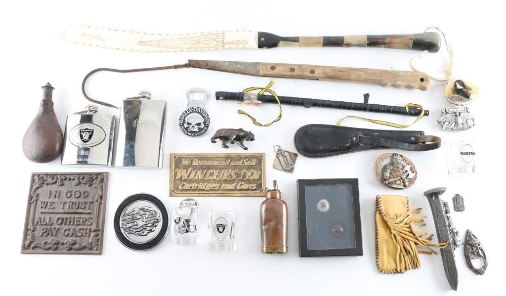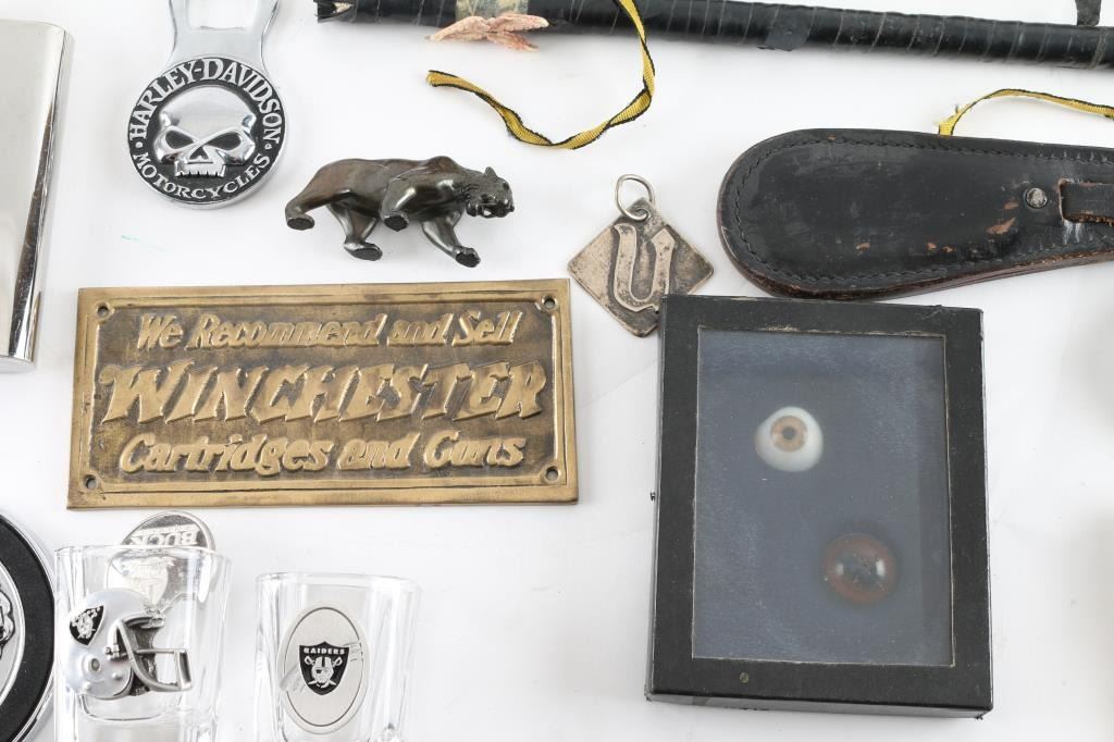 (2) Powder Flask one of copper antique and possibly British (2) Glass Eyes (1) Flask (1) Railroad Tie (1) Hay thrower (1) Horn handled Argentina made ship (1) Brass Winchester plaque (1) Leather Spat (1) Raiders shot glasses (1) Harley Bottle Opener (1) Harley Coaster (1) In God we trust plaque