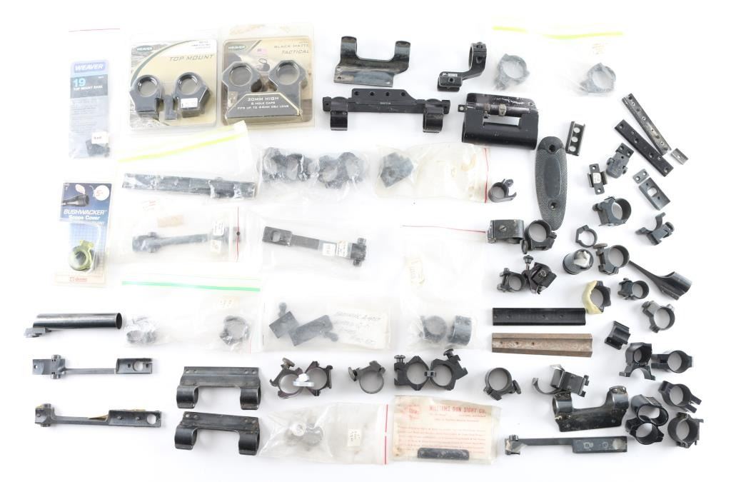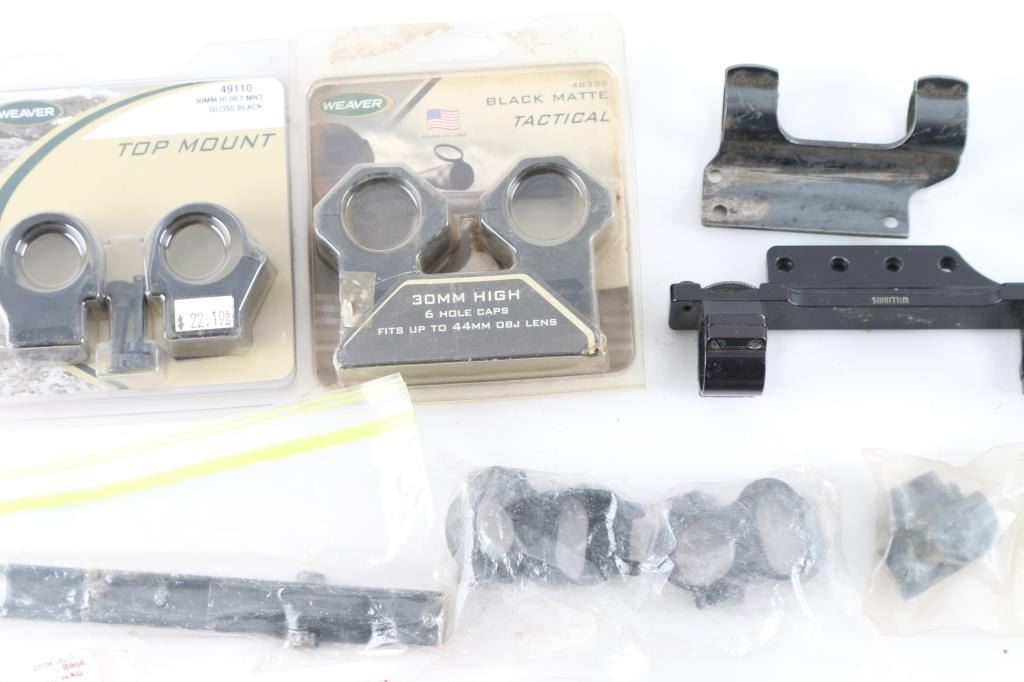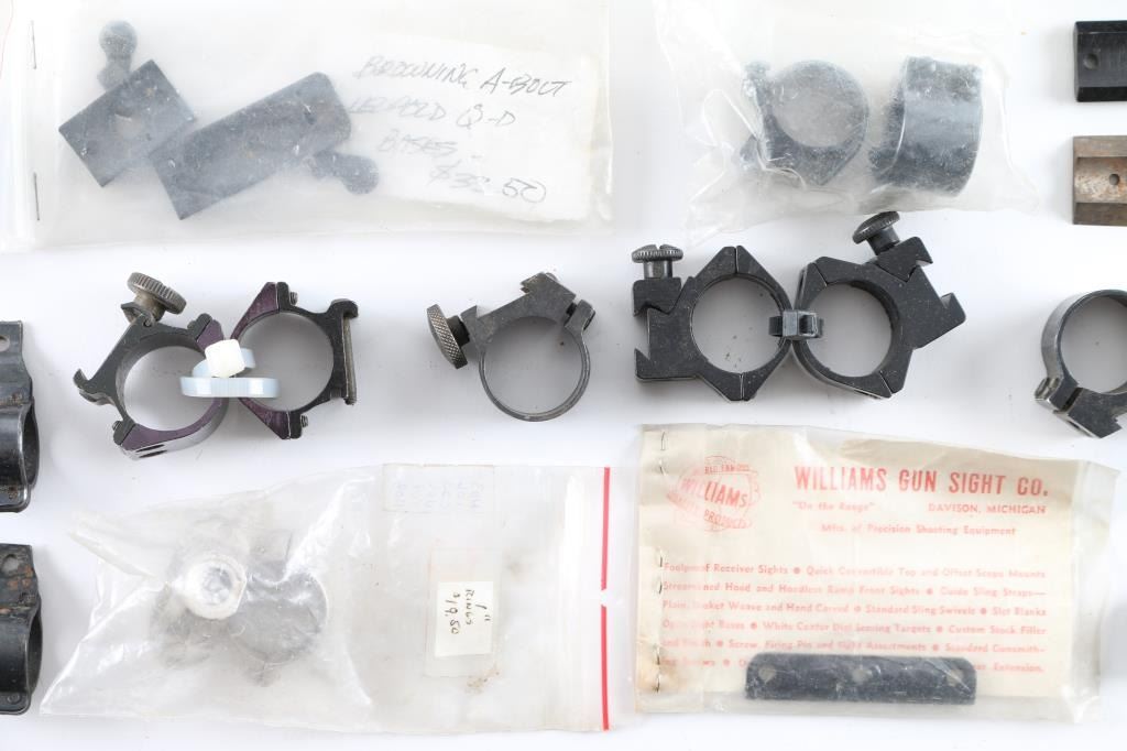 Includes weaver top mounts for a 30mm, with mount plates and screw brand new in the box, also included is bushwhacker scope cover. A Williams gun sight mount with plates and screw, and several Bushnell mount rings for various scopes in various sizes. Also included in this lot is Browning BLR scope base, a "Redfield" Jr Winchester scope mount plate.