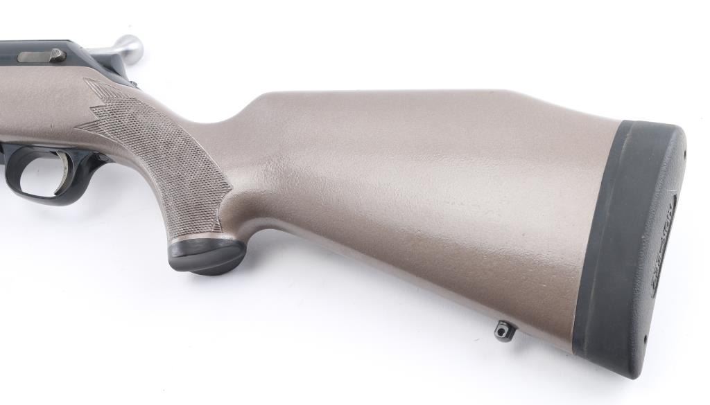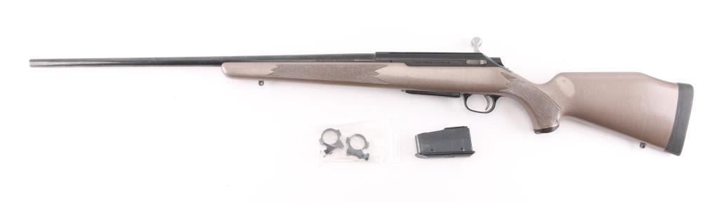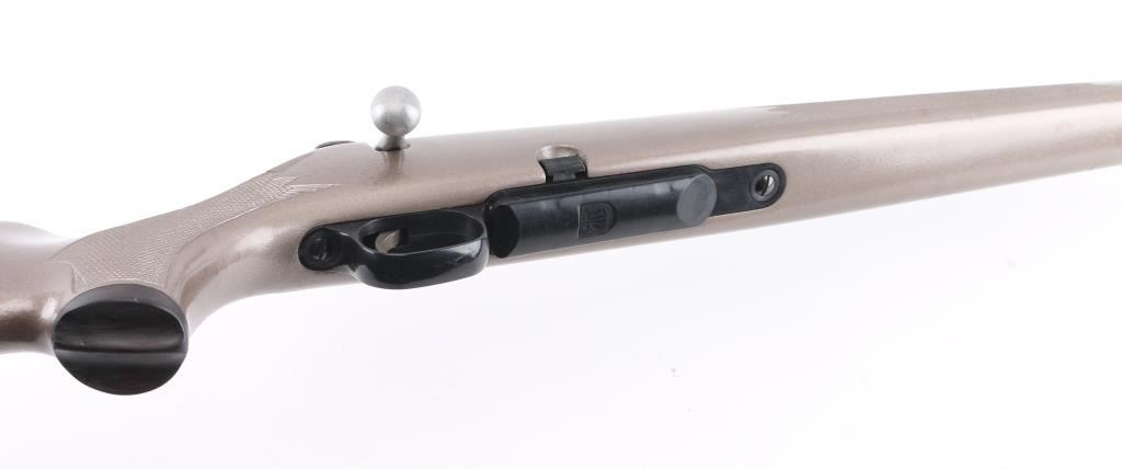 Bolt action rifle made in Finland, no importer mark observed. Features blued finish, silver colored bolt, checkered wood stock with semi-metallic pewter color paint applied, 24" barrel, no sights, detachable magazine, manual safety, 'cocked' indicator, dovetailed receiver, sling studs. solid rubber recoil pad. Bore is very good condition. Retains 80% finish, cleaned of patina in a few small areas, fading towards patina along barrel, thinning finish on inner faces of ejection port, blemishes on receiver where rings were previously mounted. Stock is very good as painted, with a few dents and other blemishes. Includes scope rings and spare magazine. Condition is NRA Very Good *** Modern Firearm ***