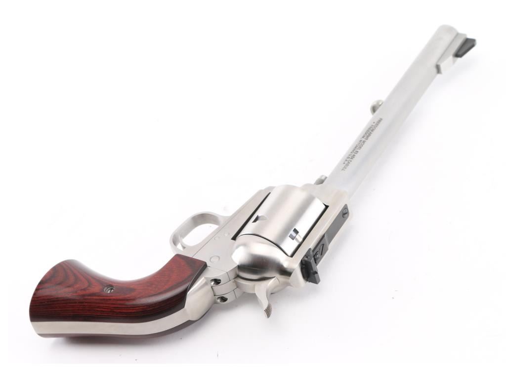 SN: D20382. Single action 5 shot heavy duty revolver. Stainless steel construction with satin finish, unfluted cylinder in polished stainless 7 1/2" barrel with serrated ramped front blade, & adjustable square notch rear sights, smooth walnut grips. Some very minor scratches on the barrel otherwise revolver is in like new condition. Comes with manual. ( Two shoulder holsters for this gun are listed in this auction) NRA Condition-Excellent. Modern Firearm.