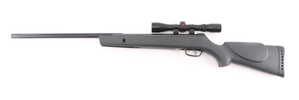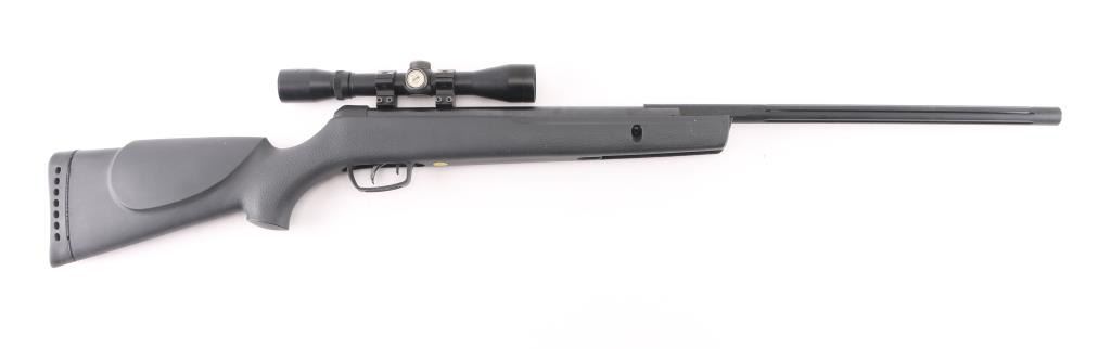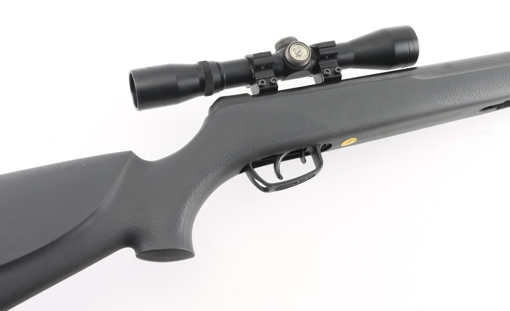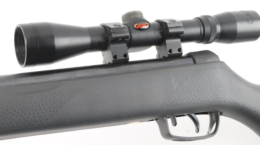 Made in Spain this is a single shot break barrel air rifle chambered for .177 pellets. The barrel reads 1200 FPS with PBA, 1000 FPS with lead. It has an 18" fluted barrel, blued finish and safety in front of trigger inside trigger guard. Black synthetic Monte Carlo style stock has cheek rest on the left side and stippling on the wrist and forearm and a rubber recoil pad. It comes with a Gamo 4x32 scope. The turret caps are missing. Metal finish looks good, some minor rust showing where barrel meets stock. Stock looks good. Bore looks bright. *Antique Firearm*
