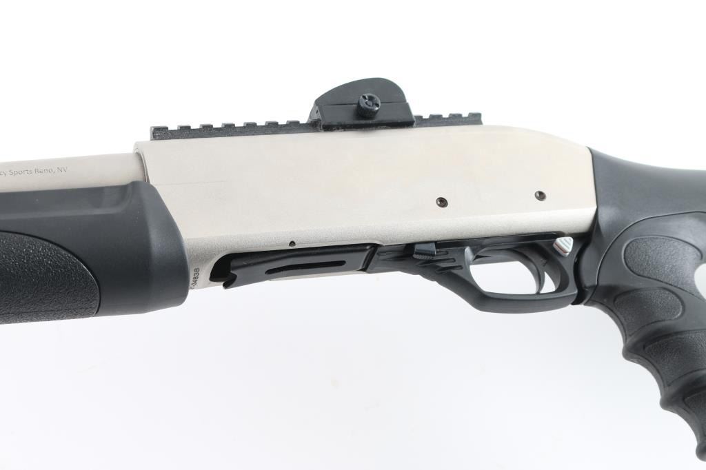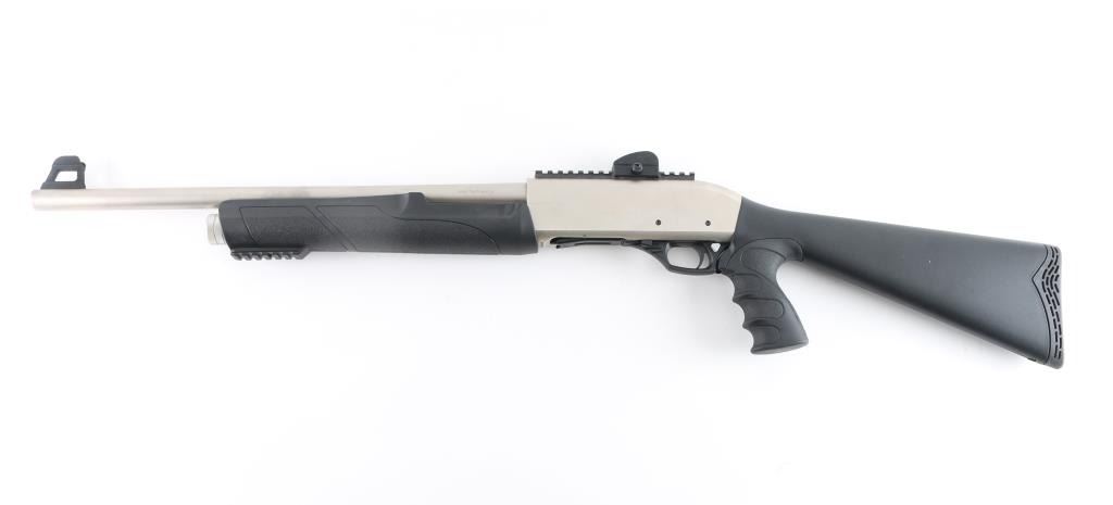 SN: 21-34838 Turkish made shotgun, imported by Legacy Sports, Reno, NV. 20" round barrel, 3" chamber, IC choke, protected red fiber optic front sight blade, adjustable peep rear sight mounted on rail, action release in front of trigger, 5+1 capacity. Matte nickel finish, black composite pistol grip stock, and forearm, manual safety, rubber recoil pad, integral accessory rail on forearm. Bore is pristine, shotgun is almost new condition. Comes in factory box, with manual, and lock. LOP is 14.5". NRA Condition-Excellent. Modern Firearm.