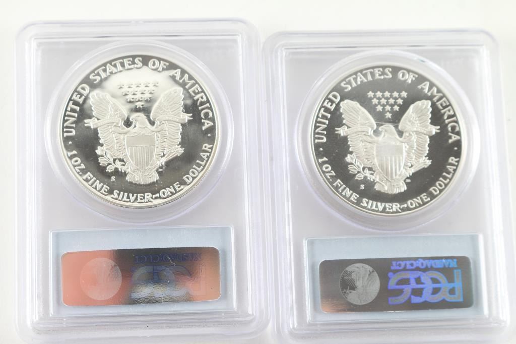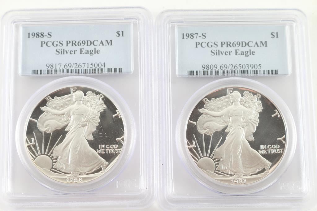Includes 1987-S PCGS certified, and a 1988-S PCGS Sliver Eagle, both in mint condition, in plastic protector cases.