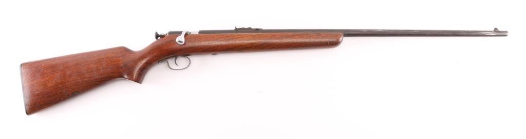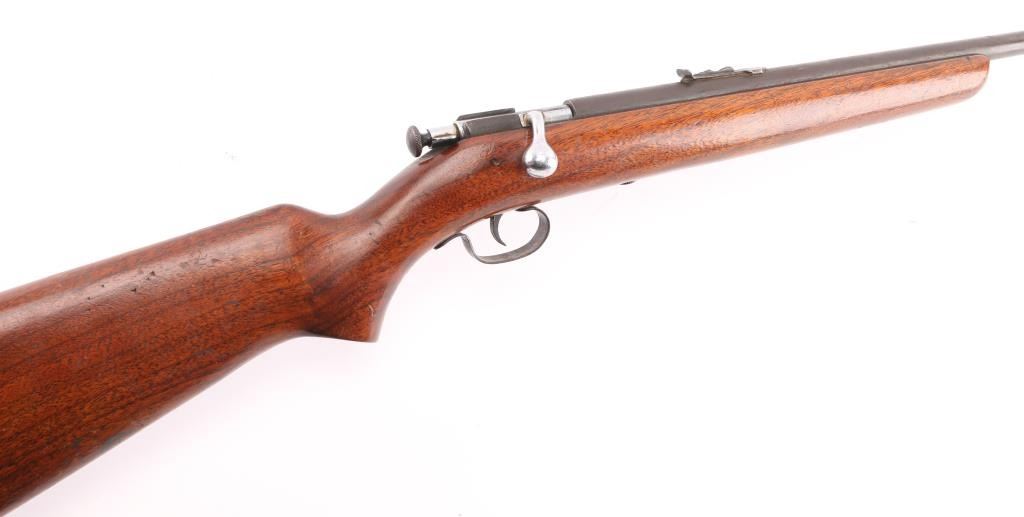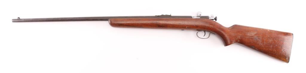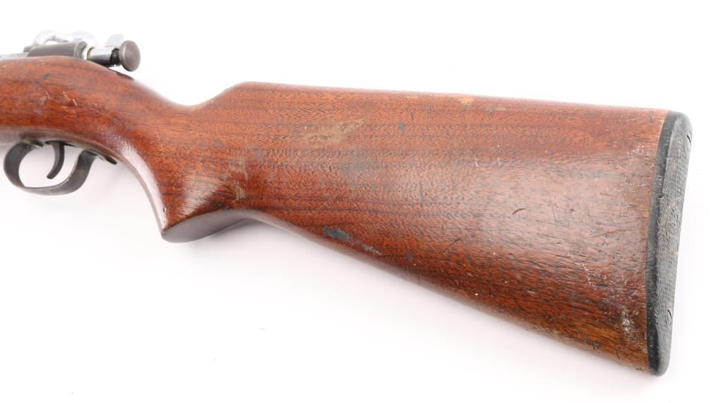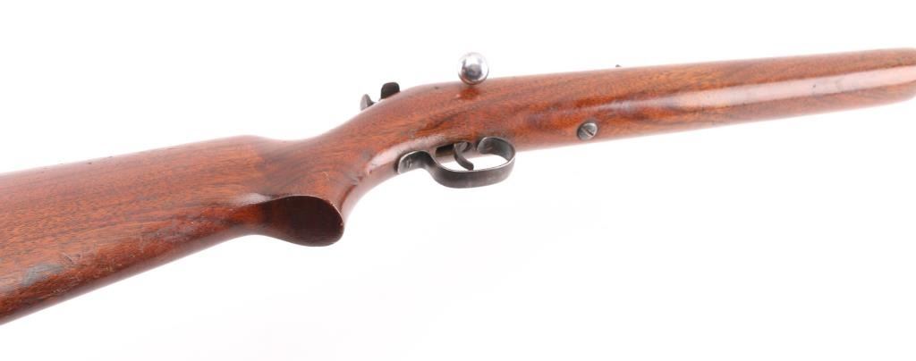 American made manual cocking single shot bolt action rifle manufactured circa 1930's-1962. Features a blued finish, 27" barrel, dovetailed blade front sight, sporting rear sight, grooved trigger, metal trigger guard, knurled cocking piece, manual safety on the rear of the bolt, smooth walnut pistol grip shoulder stock, factory composition buttplate. Bore is very good condition. Chrome finish on bolt is very good. Stock is sound with scratches/scuffs. Blue finish is turning a brown patina with scattered pin-prick patina. Condition is NRA Good. C&R Firearm.