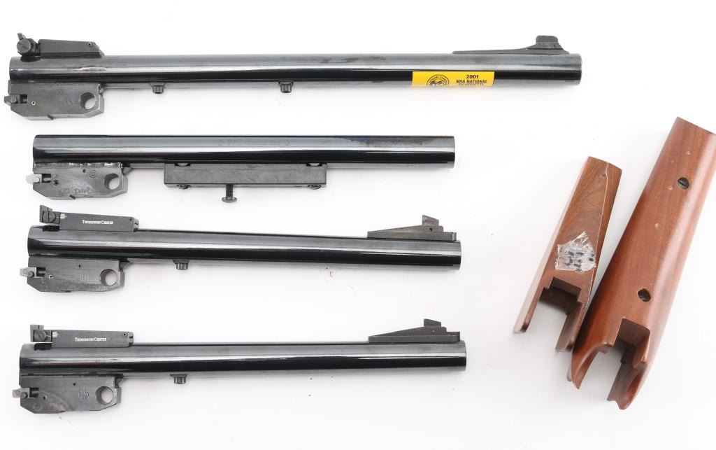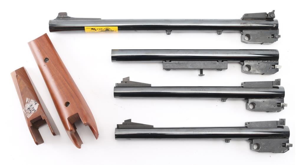 Four Total. 1) 14" blue round barrel chamber in .357 Mag. ramped front blade, micro adjustable rear sights, excellent bore . has 2001 NRA National Silhouette Championships sticker attached. 2) 10" round blue barrel chambered in .357 Mag. Ramped front blade, micro adjustable rear sights. Excellent bore. 3) 10" round, blue barrel chambered in 9mm Luger, ramped front blade, micro adjustable rear sights. Excellent bore. 4) 10" round, blue barrel chambered in 7mm TCU no sights, but drilled/tapped (No screws) Excellent Bore. Lot comes with 3 smooth walnut forearms for 3 of these barrels. All in excellent condition.