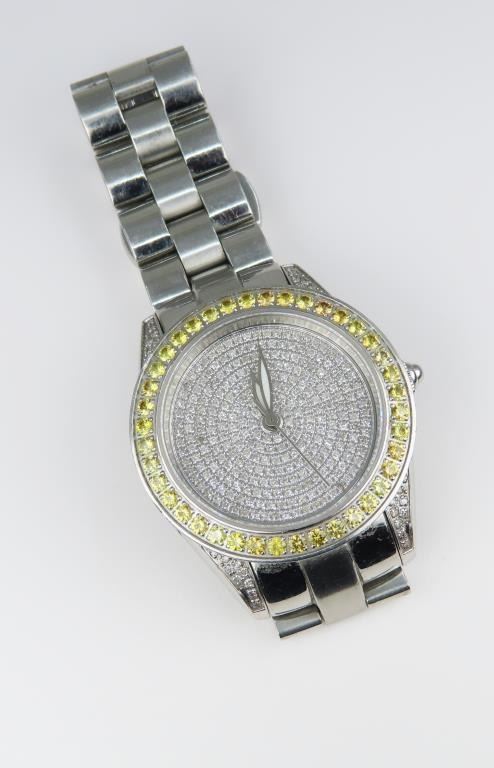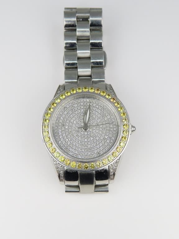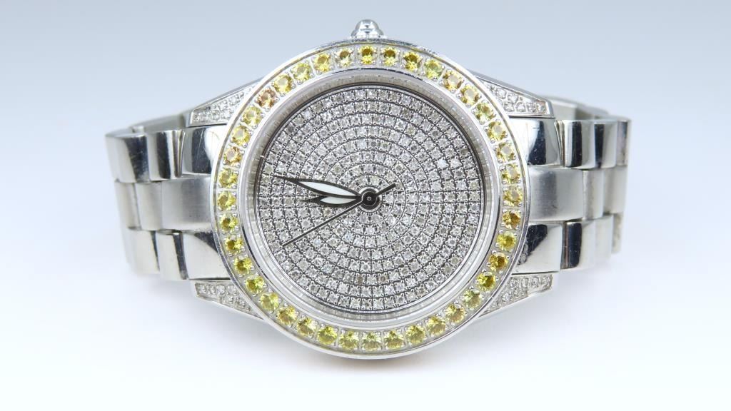 Stunning INVICTA Swiss Made Unisex Sapphire Diamond Watch Mint Condition featuring over 370 pave set round Diamonds on the face with G-H colors framed with 40 round Yellow Sapphires total weight of stones approx. 4.00 carats. Watch is made in Stainless Steel, water resistant up to 50 meters, with model number on back of watch.