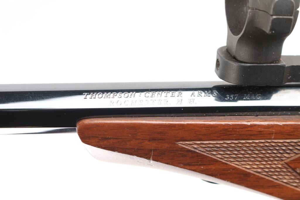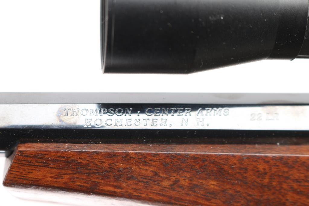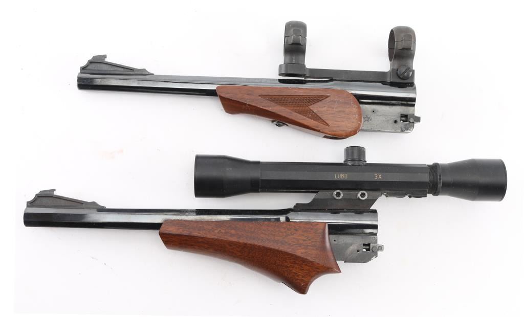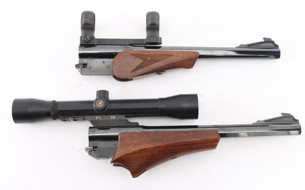 Two Total. 1) 10" round/octagonal round, blue barrel chambered in .22 LR, ramped post/bead front sight, smooth walnut forearm. Mounted with a Thompson center Lobo 3x scope. Bore is excellent, scope is out of focus. 2) 10" round/octagonal, blue barrel chambered in .357 Magnum. Ramped post/bead front sight, has 1" rings and base. Checkered walnut forearm. Chamber and lower bore has scattered spots of rust, may improve with cleaning,