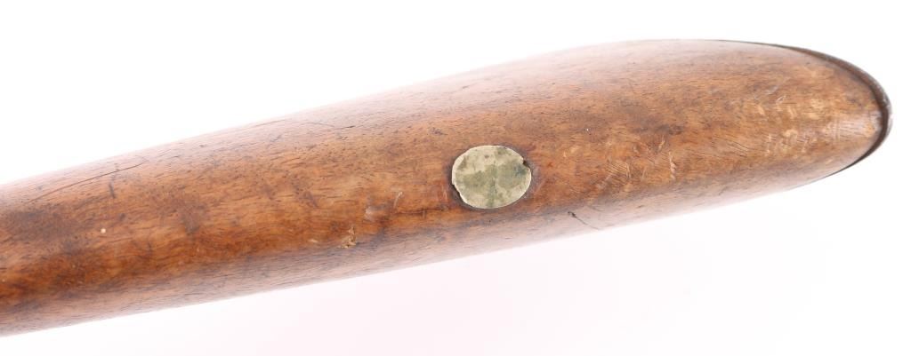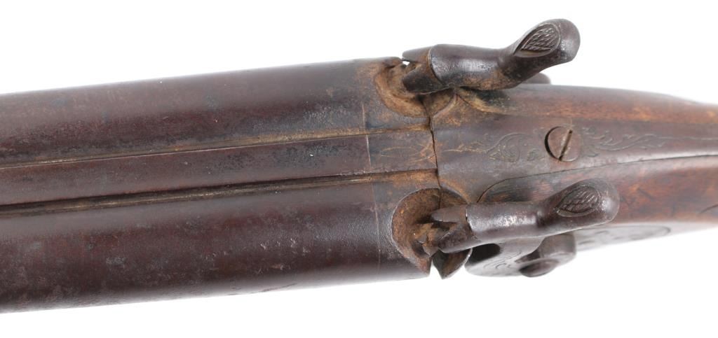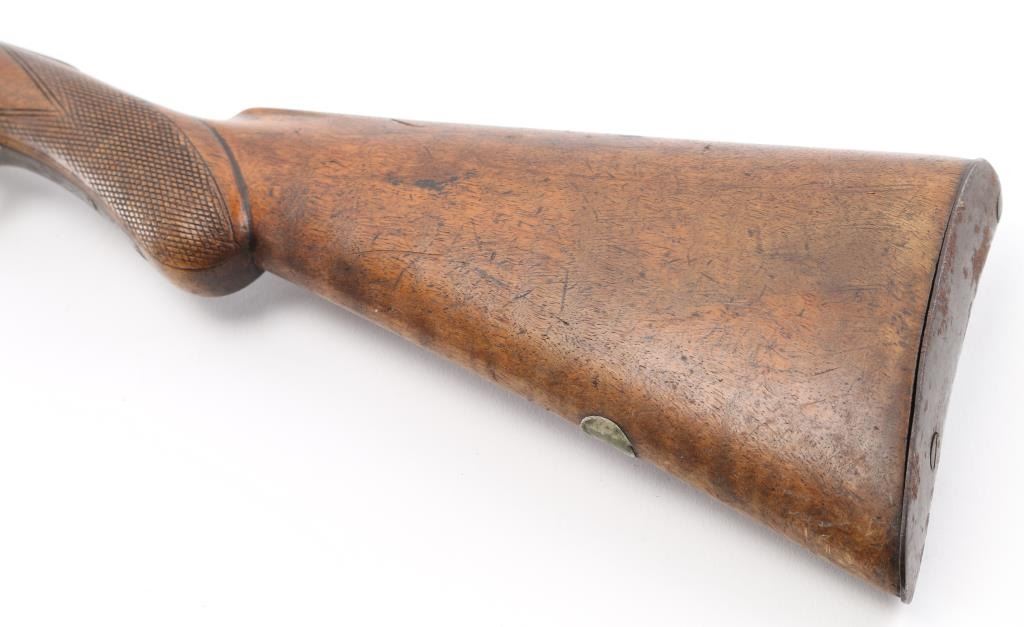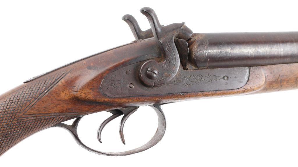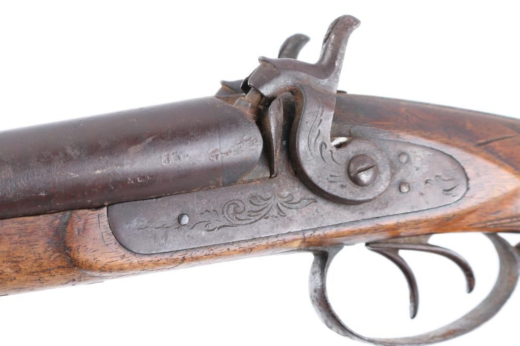 Unsigned breech-loading antique shotgun. 30" barrels, double triggers, lightly engraved hammers/locks. One piece wood stock with "Prince of Wales" grip, steel butt plate, wooden ram rod not original to gun. Right hammer fires at half cock, left at full., Metal has turned a dark brown patina with scatted pitting/rust spots, wood is sounds with scratches/dings. Bores are dark/dirty. Basically a wall hanger. NRA Condition-Fair. Antique Firearm.