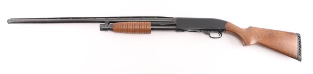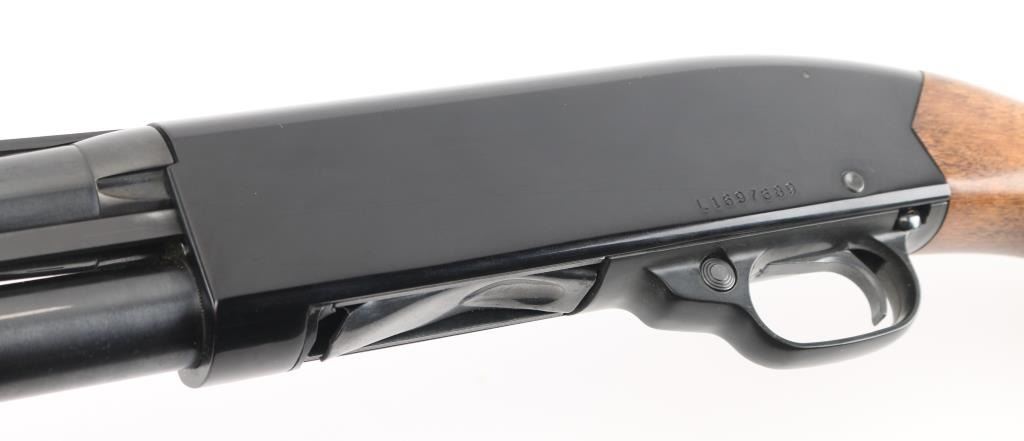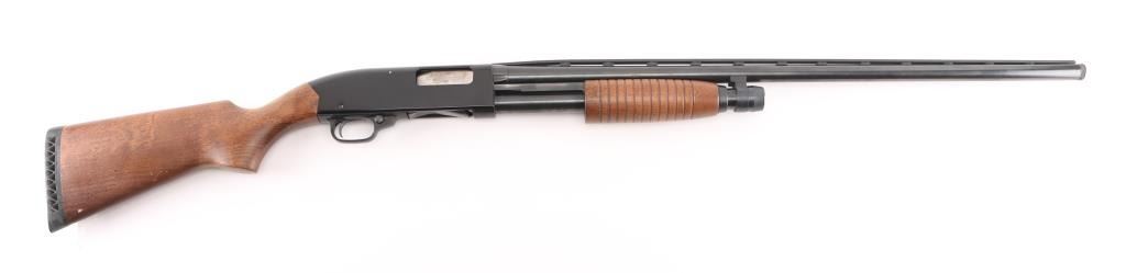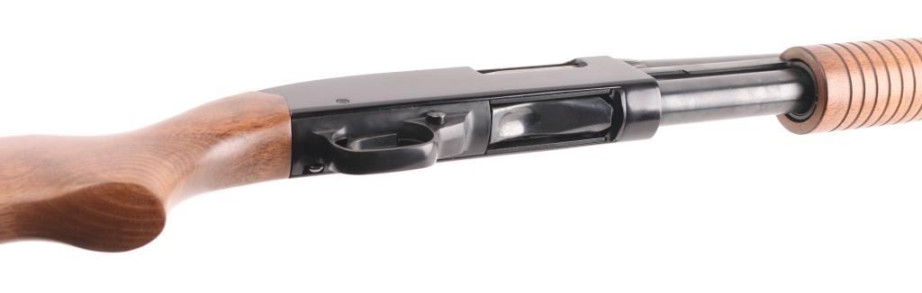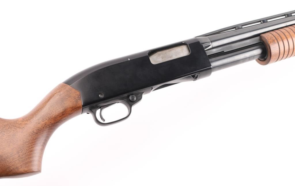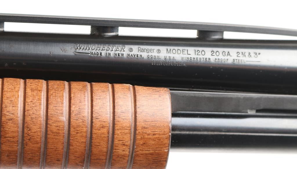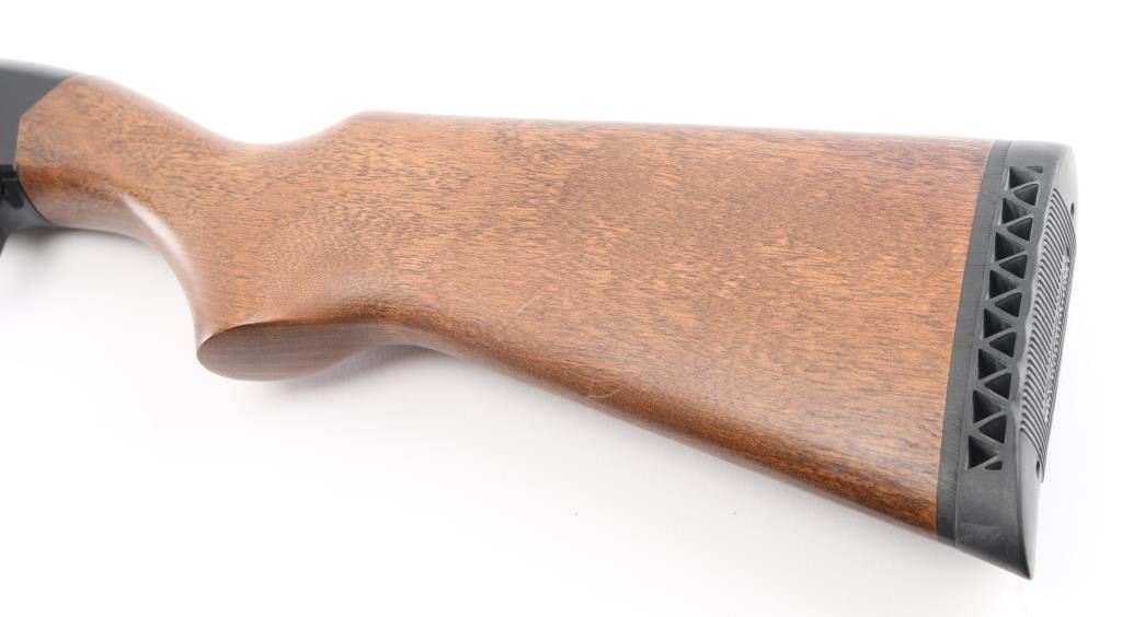 'Ranger' American made slide action repeating shotgun chambered for 2 3/4" & 3" 20 gauge shells. Features a blued/black finish, 28" round vent rib barrel with installed IM choke, missing front sighting bead, half-length tube magazine, smooth trigger, polymer trigger guard, push button safety, grooved wood slide handle and smooth pistol grip shoulder stock with black plastic factory recoil pad & 14" LOP. Two slide action bars. Shotgun exhibits approximately 95% of it's original finish with some minor scratches. Shotgun is mechanically sound , the action is smooth/tight. The bore is pristine with some carbon in the chamber, and the wood stocks are very good with minor scratches. Condition is NRA Very good. Modern Firearm
