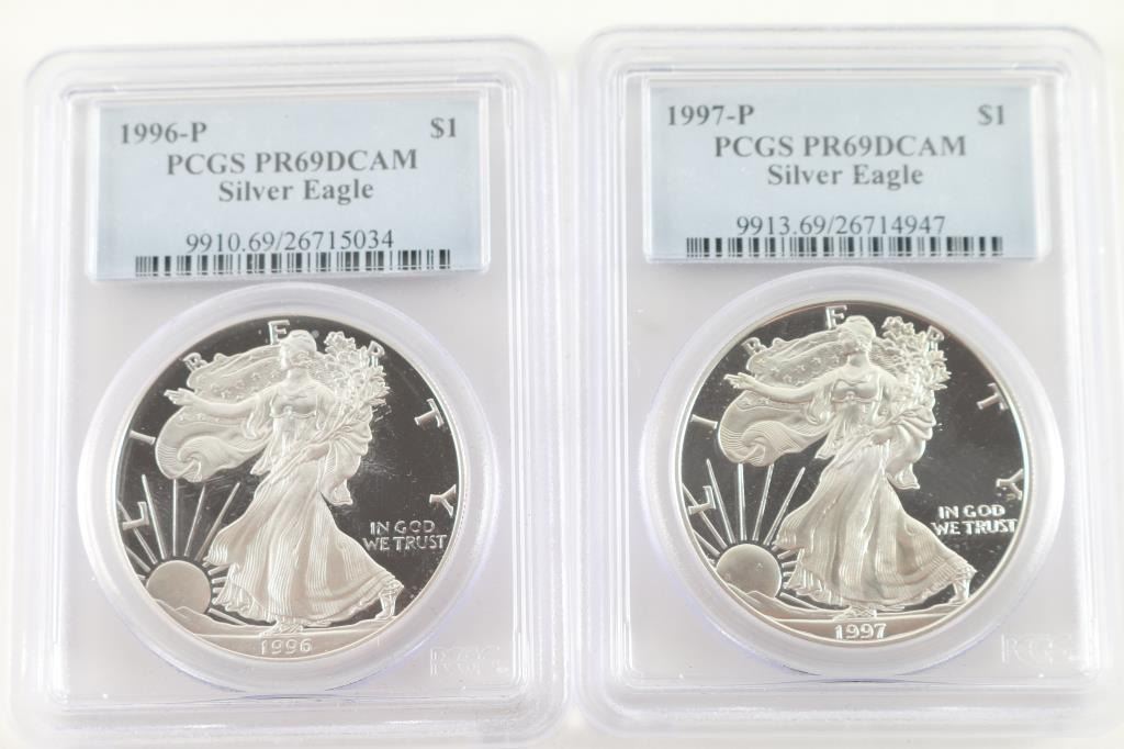 Includes 1997-P PCGS Sliver Eagle, and a 1996-P PCGS Sliver Eagle. Both in mint condition, in plastic protector cases.