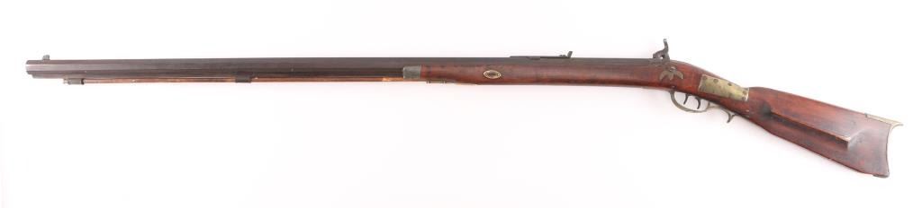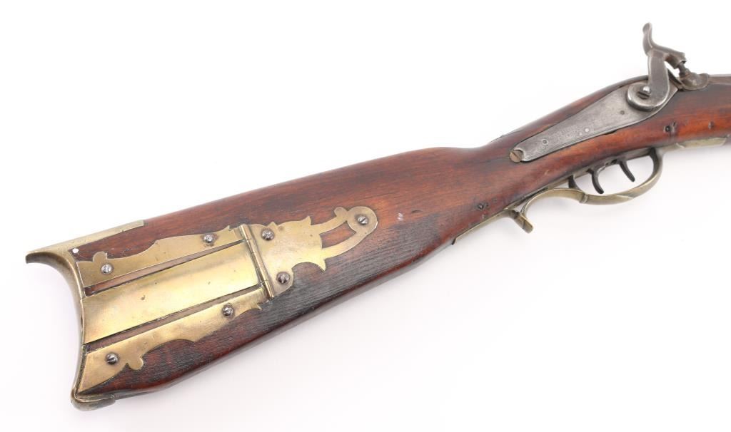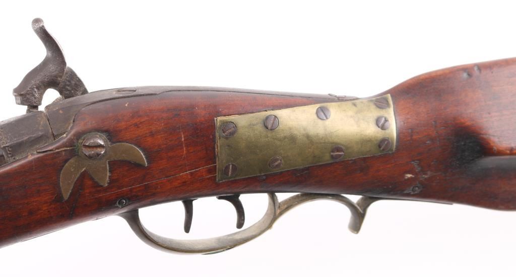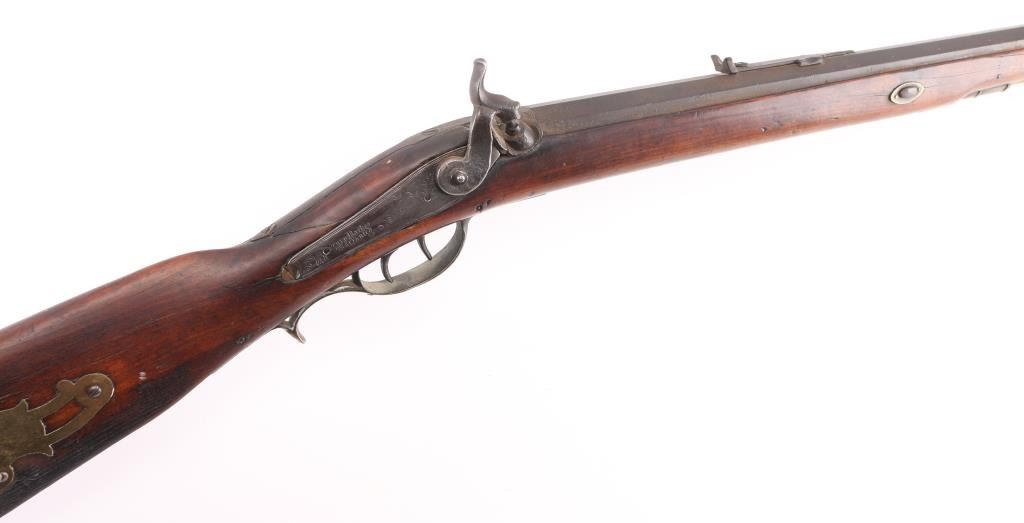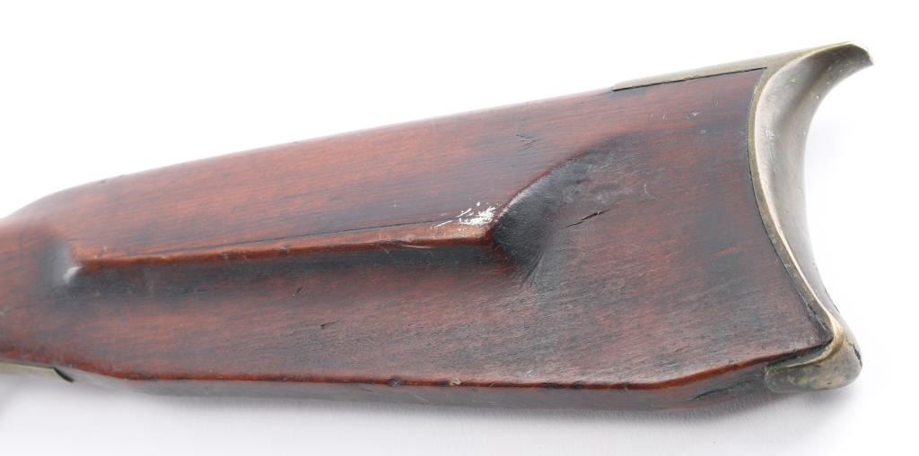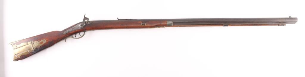 40" heavy octagonal barrel with fixed front and rear sights. Light scroll engraved lock marked: HENRY PARKER / WARRANTED. Dual triggers. Checkered walnut half-stock, brass hinged patch box, triggerguard and cheek rest. Crescent buttplate. Wood ramrod. Henry Parker was a lock maker of note but sold to everyone (1830's-1890's)Left wrist has been repaired with a brass plate, hammer does not cock, lock plate & patch box have been cleaned, finish has turned a brown patina. NRA Condition-Fair. Antique Firearm.