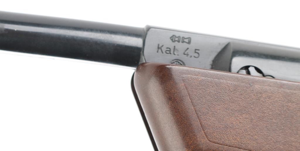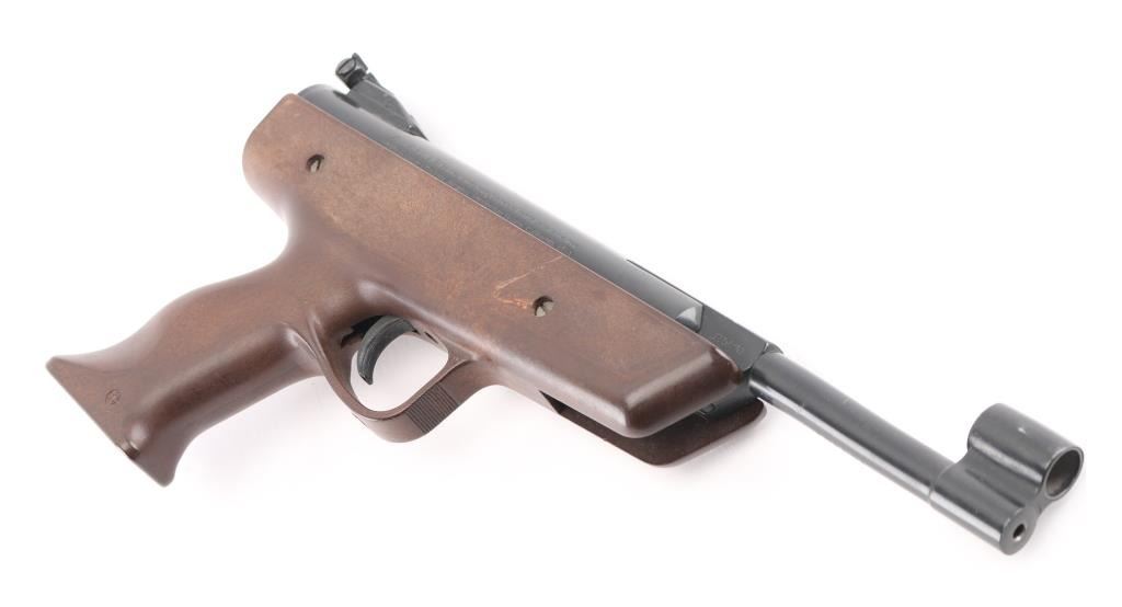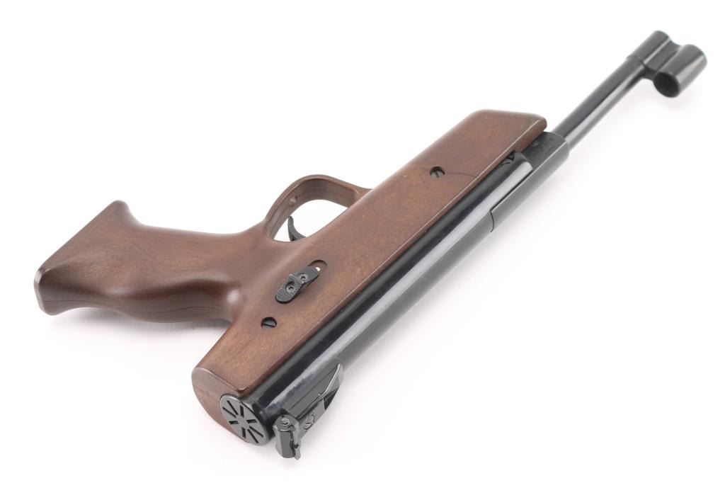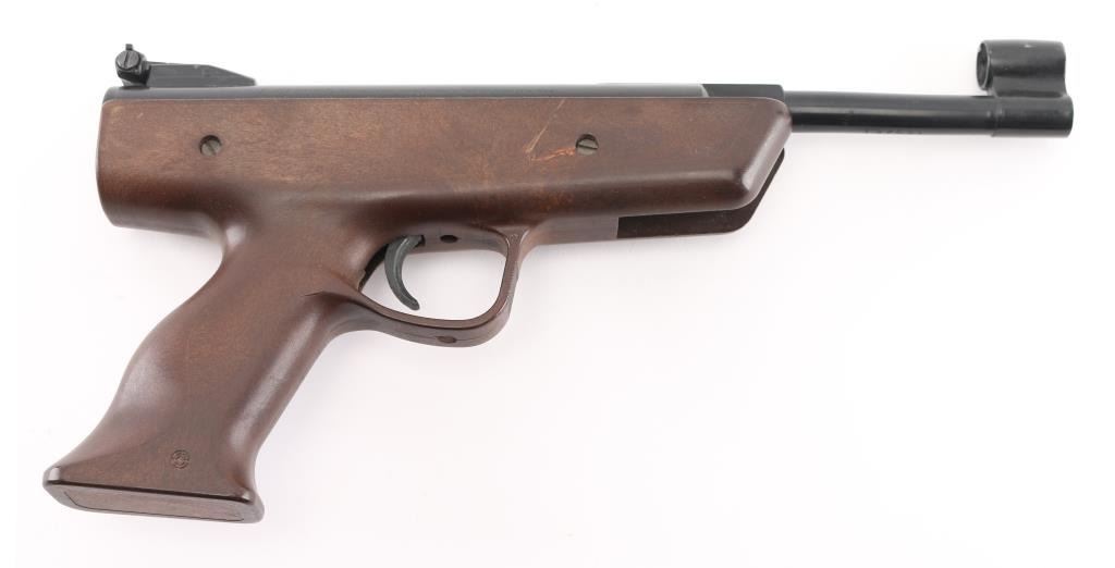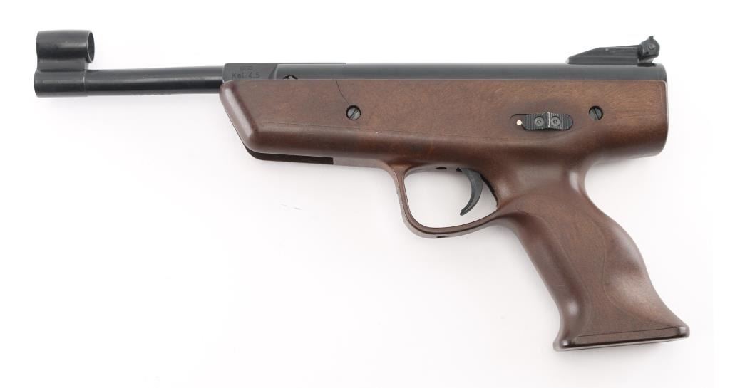 Barrel break open air pistol by Beeman. It has a 6.25" barrel, hooded front sight, adjustable rear sight, no idea what the frame is made of, serrated trigger, and thumb safety on the left. Gun looks good. Bore looks good. Condition is good.