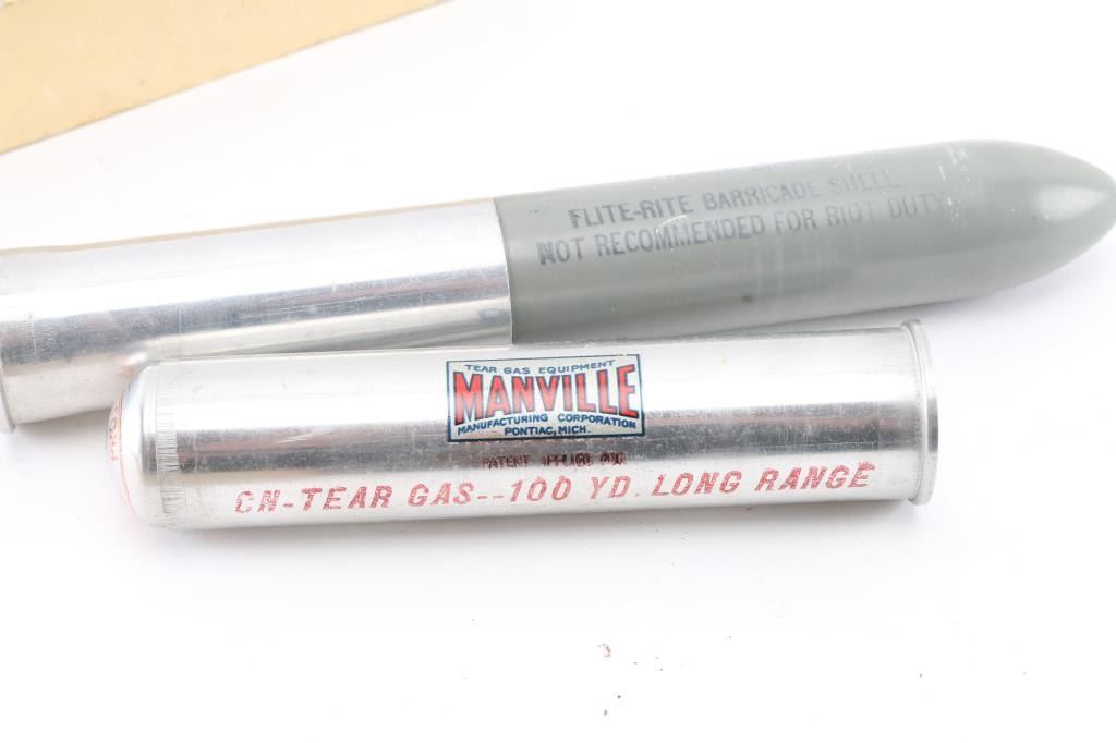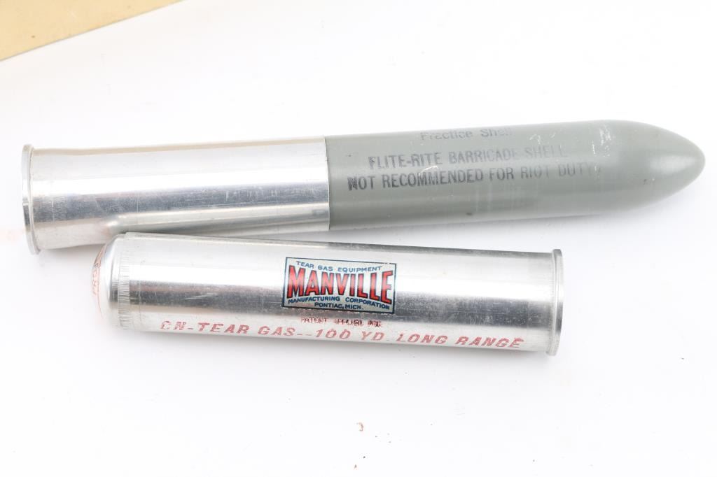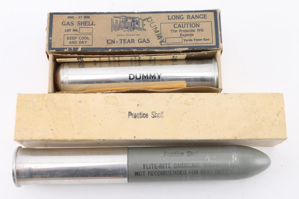 Includes "Manville" 37mm tear gas dummy shell with the box, dated 1937, with instructions. Also included is a federal labs 37mm flite-Rite dummy practice shell with box. Both in good condition.