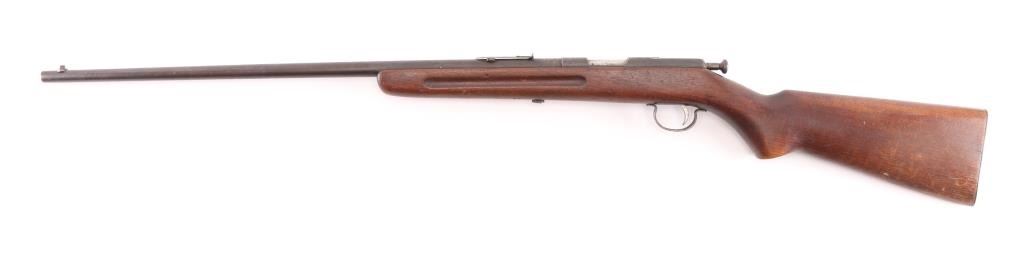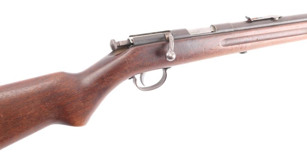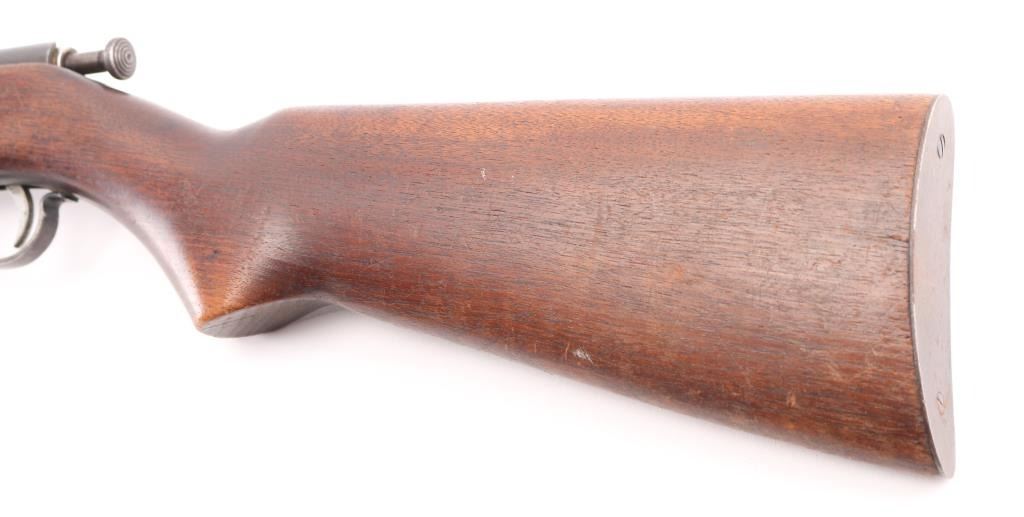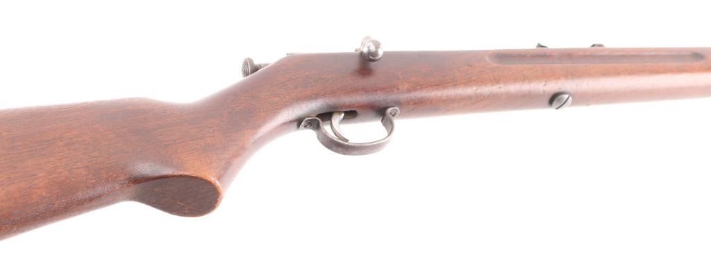 American made single shot rifle, bolt action, approximately 24" barrel, bore is dull but might improve with cleaning, blade front sight, buckhorn rear sight, smooth trigger, wood stock, metal buttplate, barrel and receiver show light corrosion with approximately 50% of finish remaining, stock has scratches and dings, LOP is approximately 13 1/2". This rifle was manufactured between 1932 - 1935. **NRA Poor** Modern Firearm C&R Eligible