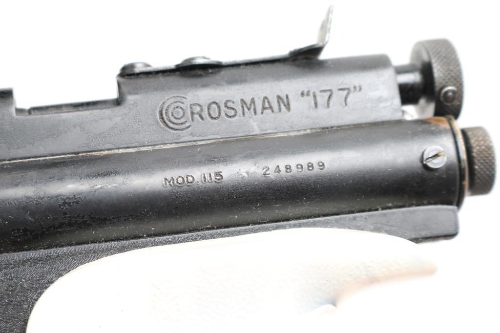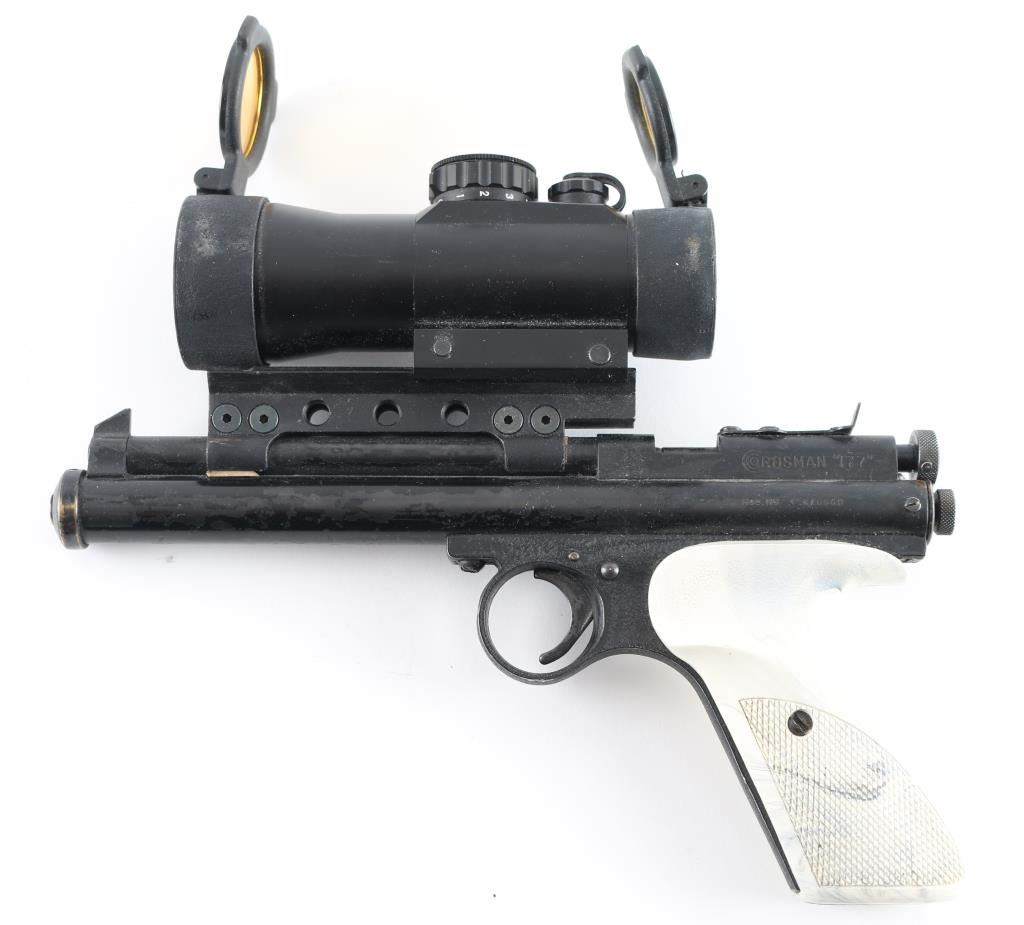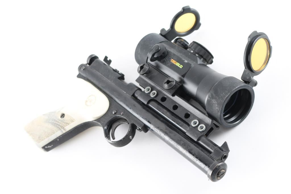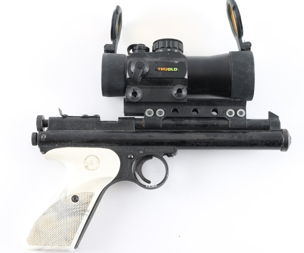 Model 115, 177 CAL, features white plastic grips, a "truglo" red dot Acog sight. Everything is functional, has some condition issues with the outside finish faded away. SN:248989
