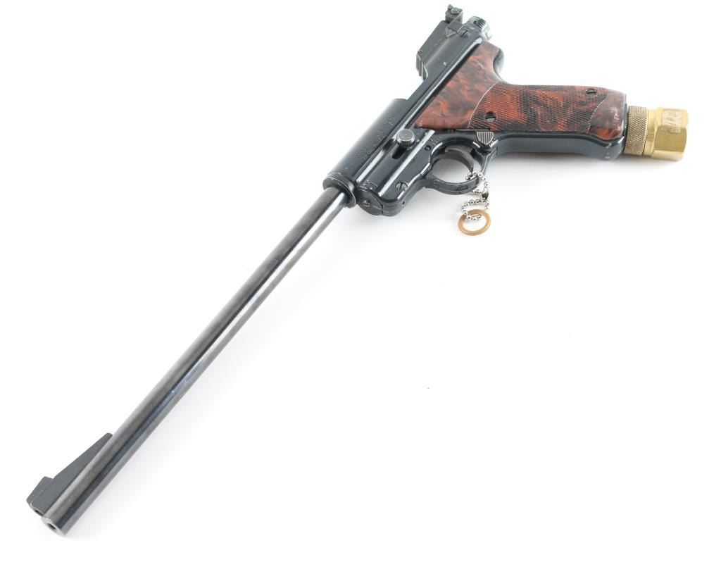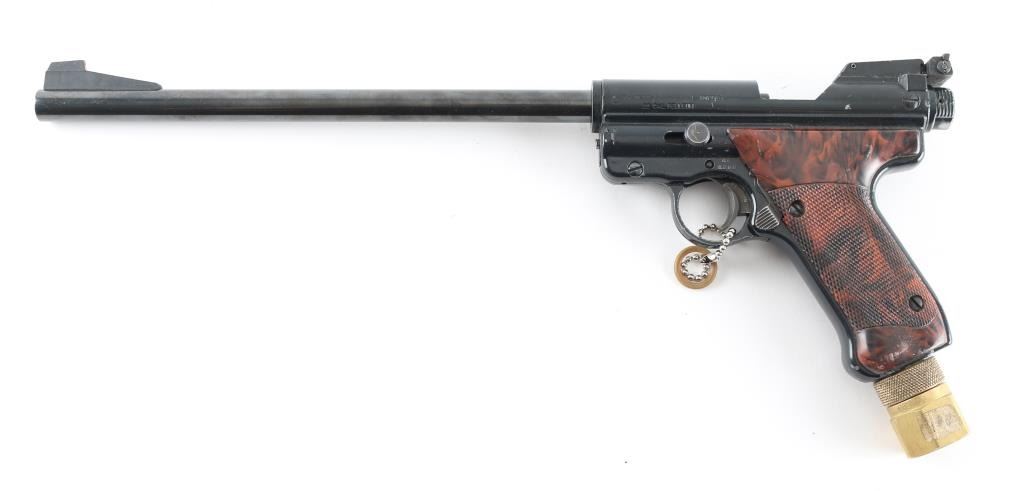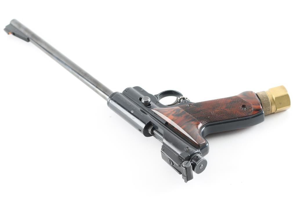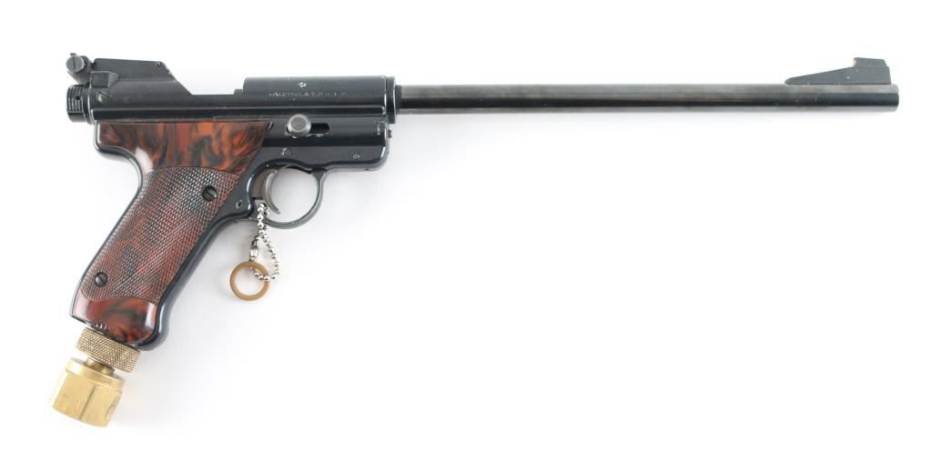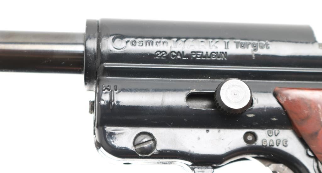 The .22 caliber Mark I Target pistols were made by Crosman from 1966 to 1983. In 1980 Crosman removed the power adjustment capability from the gun, so those made from ’66 to ’80 are called the first variation, while those made from ’80 to ’83 without power adjustment are called the second variation. This first variation of the gun are considered more desirable, only because of the additional feature of power adjustment. This pellet gun is in good condition with minor ware along edges of trigger guard.