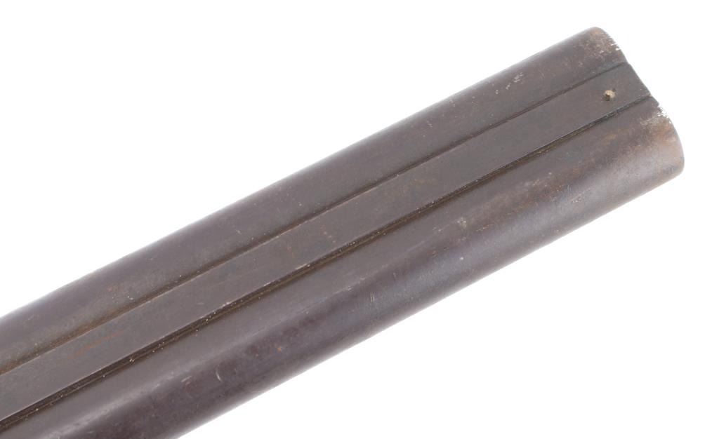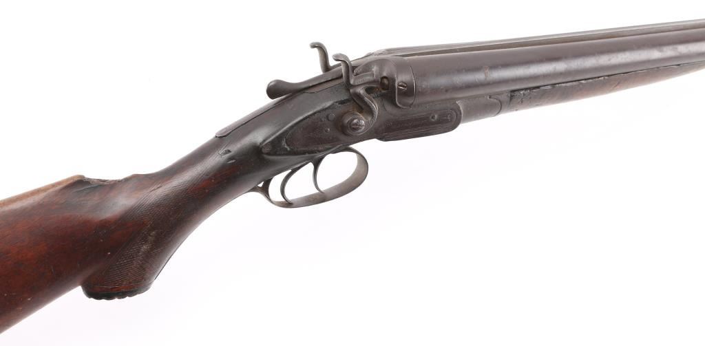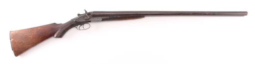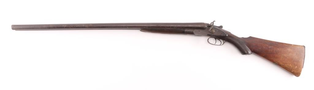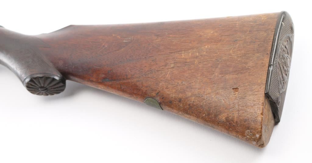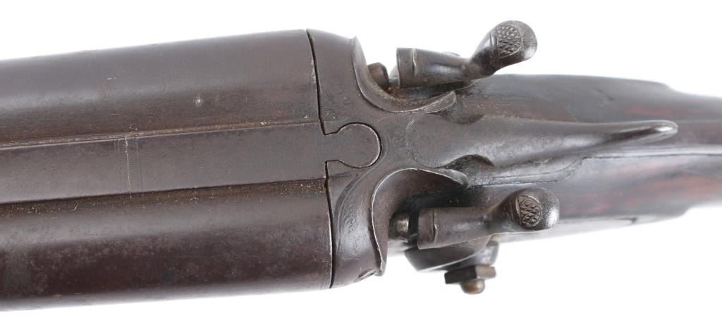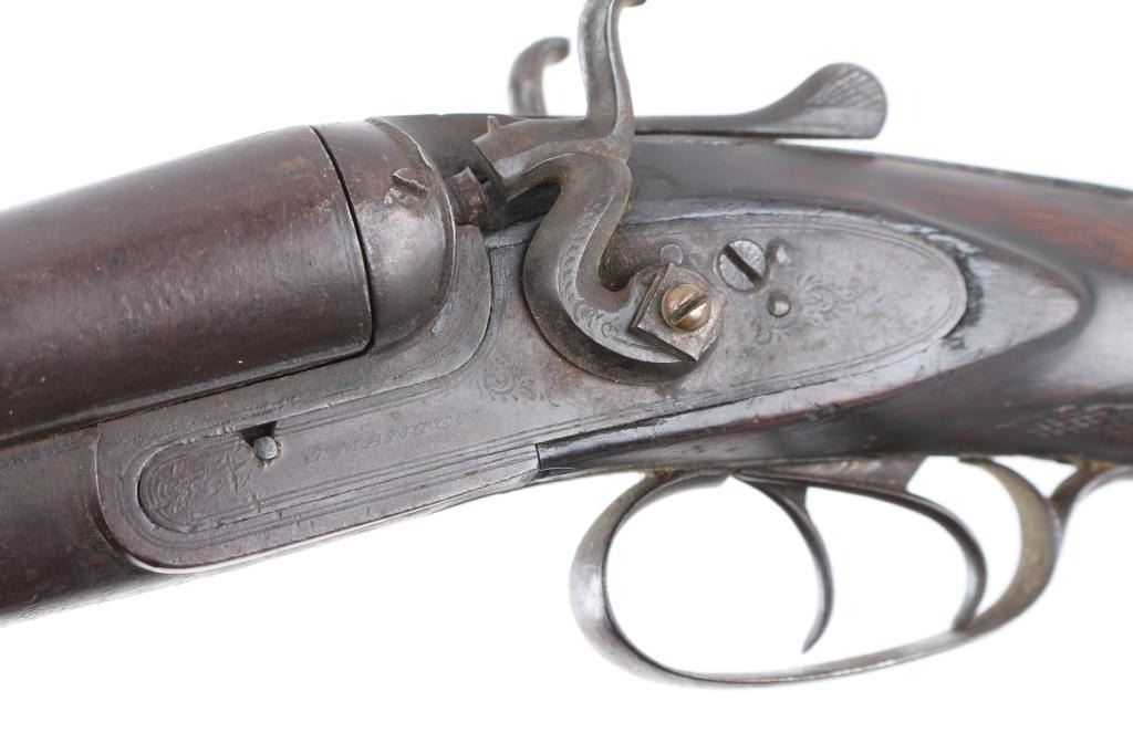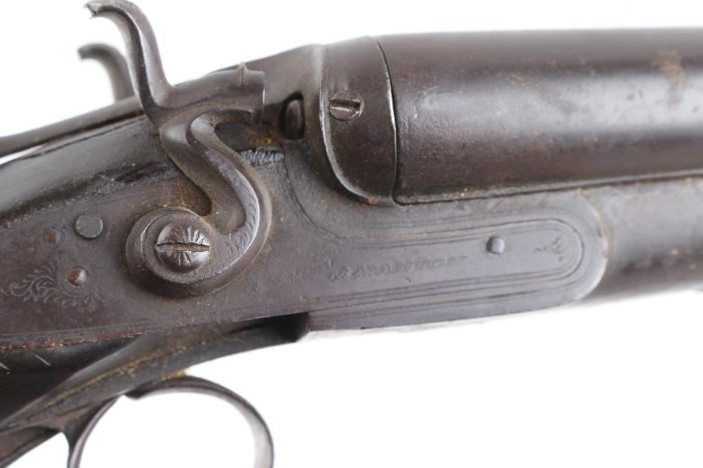 British make double barrel shotgun. Features exposed hammers, back locks, double triggers, 32" Steel barrels with low smooth rib, brass bead front sight, top lever opening, checkered wood forend , grip wood butt stock with shallow checkered wrist, horn grip cap smooth metal buttplate. Bores are rough, many small areas of light pitting throughout. Barrels are brown color, mottled shades, light patina in several places. Other metal is grayish color with darker spots from cleaned patina. Hammers are slightly loose, action operates properly,. Wood is fair condition, distressed with many dents "J MANTON & Co" on lock plates is feint, British proofs, serial number matched in 3 places. Screw on left hammer is replacement, butt plate has a 1' chip on the bottom, there is a chip out of the comb, and under the right lock plate. Joseph Manton (1766-1835) has a Wikipedia page. Condition is NRA Fair/ Antique Firearm.