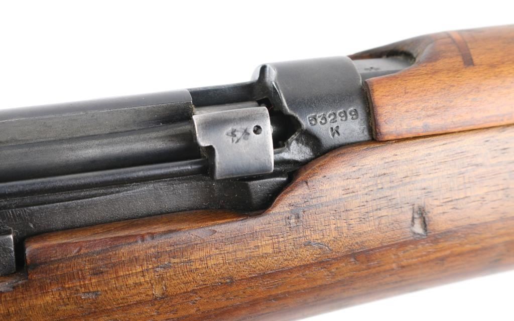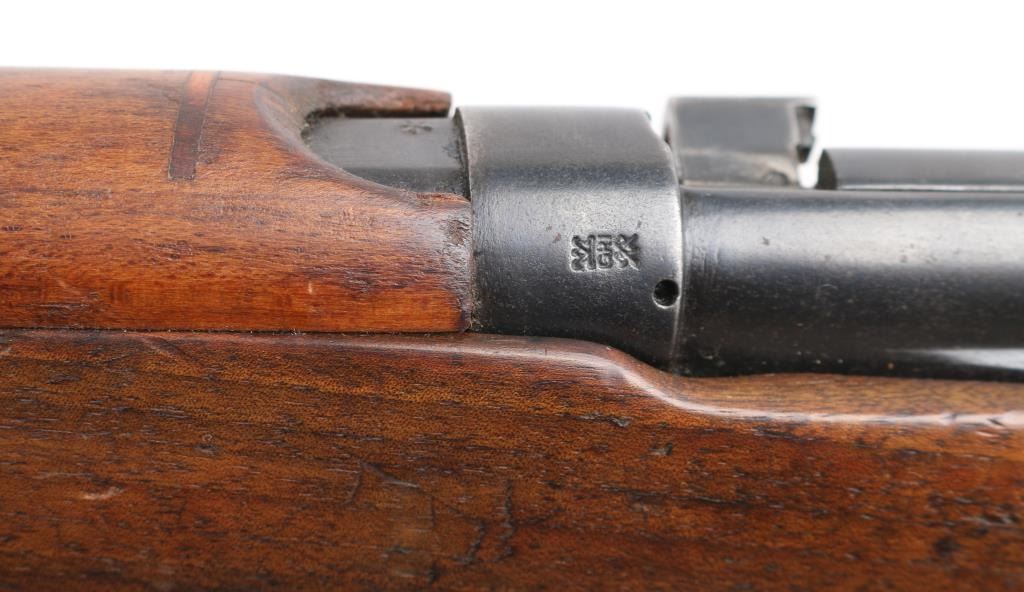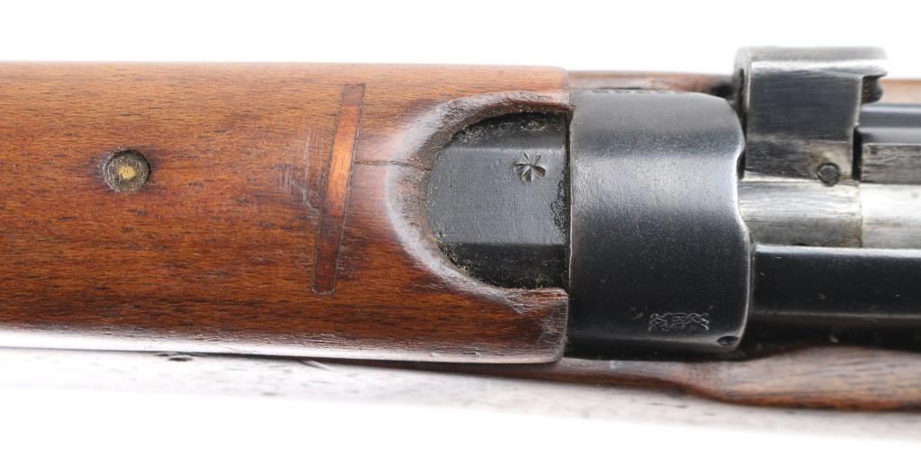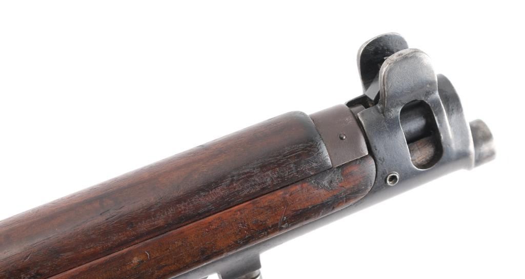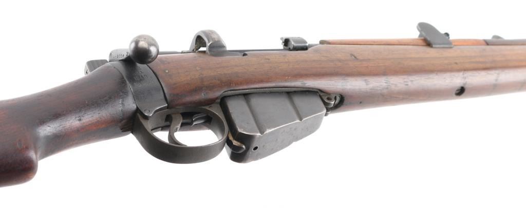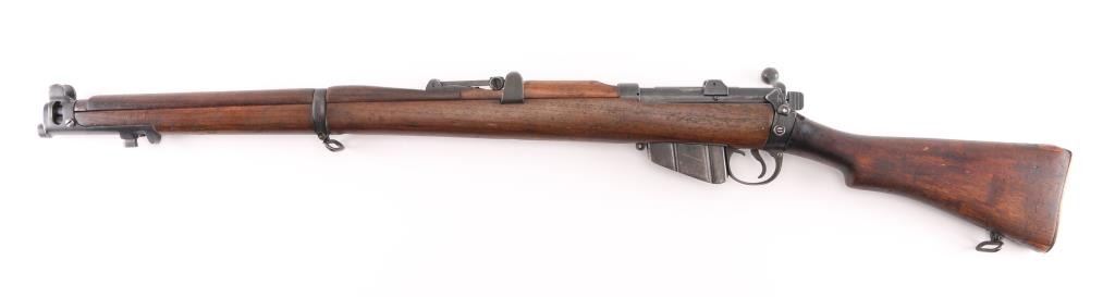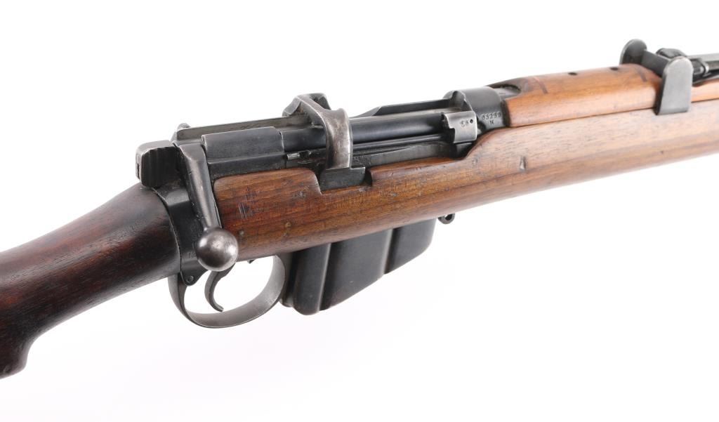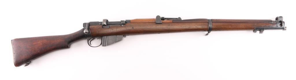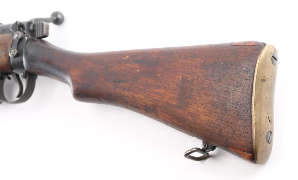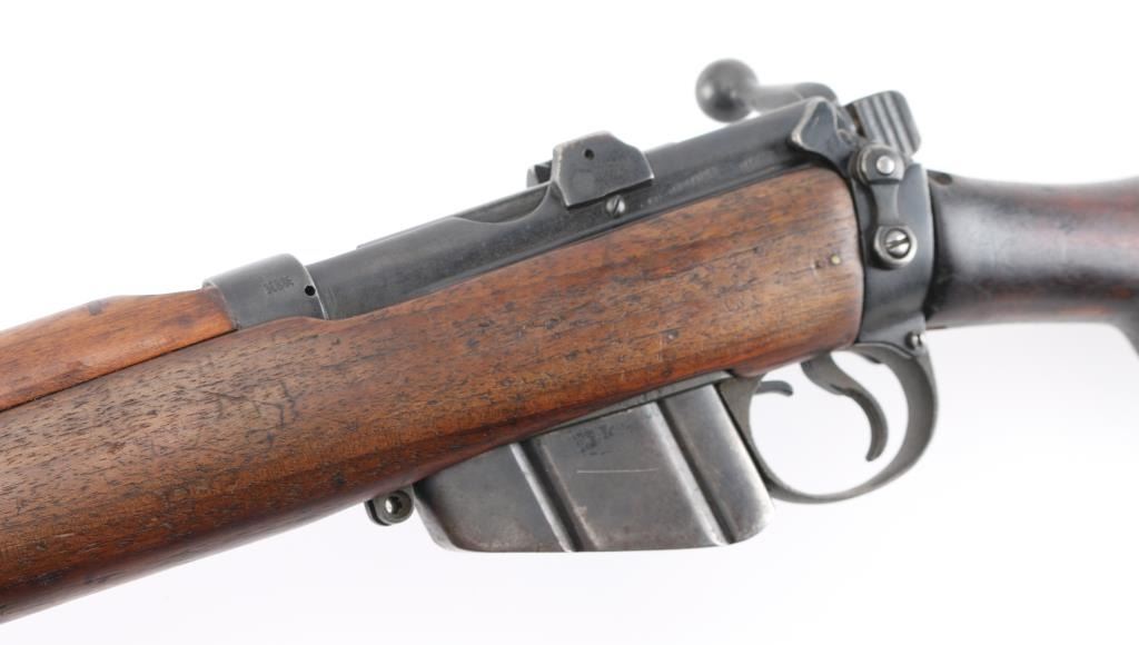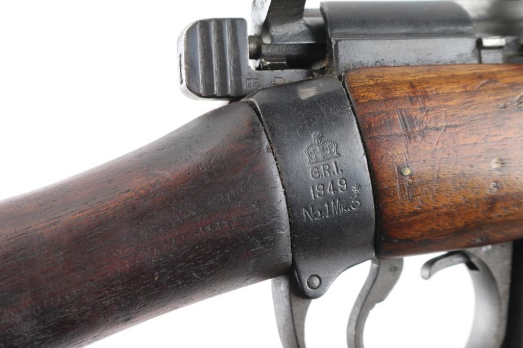 British Empire Indian military bolt action rifle dated 1949. Features 25" barrel, bayonet lug, protected post front sight, adjustable rear tangent sight with protective ears, 10 round detachable magazine, stripper clip guide bridge, magazine cut off, manual safety, sling swivels, two piece wood stock with straight grip, brass buttplate with trap door storage compartment. Nosecap is a variant lacking any provision for a stacking swivel. Bore is very good/bright, with strong rifling. Metal has 85% blue finish, bare metal on some sharp edges, handling wear. Wood is very good with minor scratches/dings. Small importer marks on left receiver, very feint, unable to read. NRA Condition-Very Good. C&R Firearm.