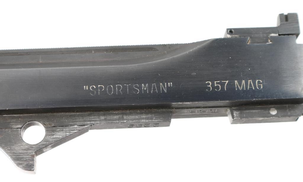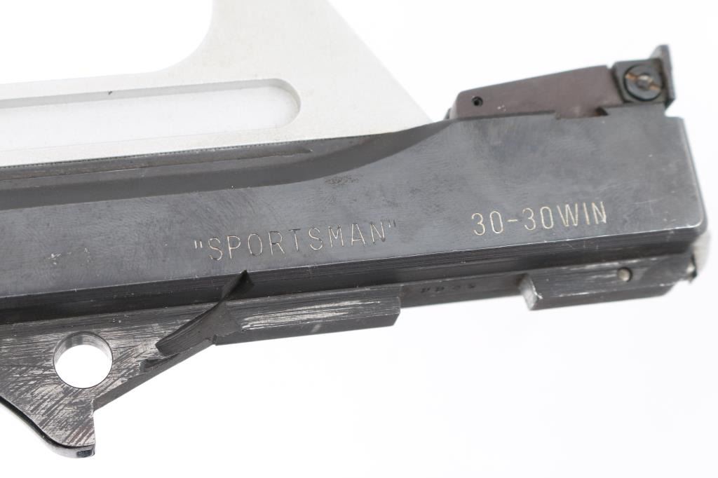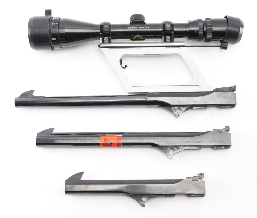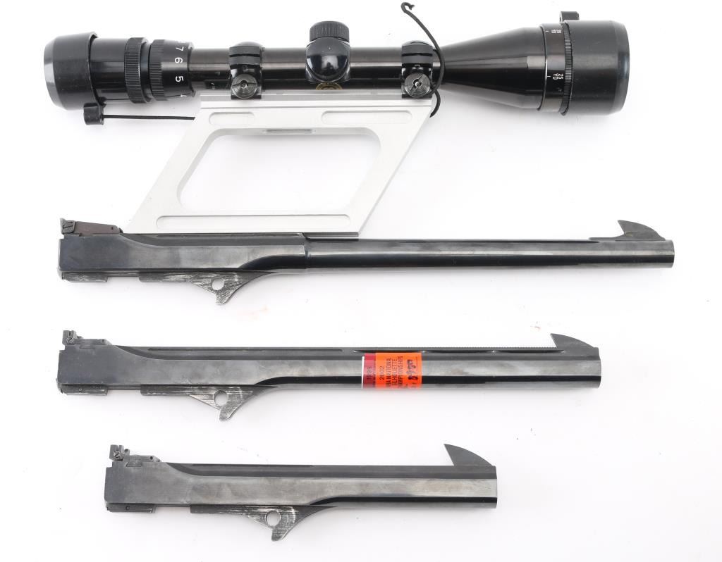 Three total. These are rare to find. All 3 are numbered "2289". 1) 8 1/4" slab sided blue barrel chambered in .44 Mag. raised rib with large front sight blade, micro adjustable rear sight. Bore would be excellent/bright, except for a small area of light pitting in the lower bore. 2) 12" slab sided , blue barrel chambered in .357 Mag. , raised ventilated rib with large front sight blade, micro adjustable rear sight. Rib drilled/tapped. Bore is excellent/bright, needs cleaning. Has NRA National Silhouette Championships sticker attached. 3) 14" round/slab sided barrel chambered in .30-.30 Win. Dovetailed front sight blade, micro adjustable rear sight. Bushnell Sportsview scope mounted on high base. Power info worn off. Clear optics. Bore appears very good with some dark areas above the chamber, should improve with cleaning.