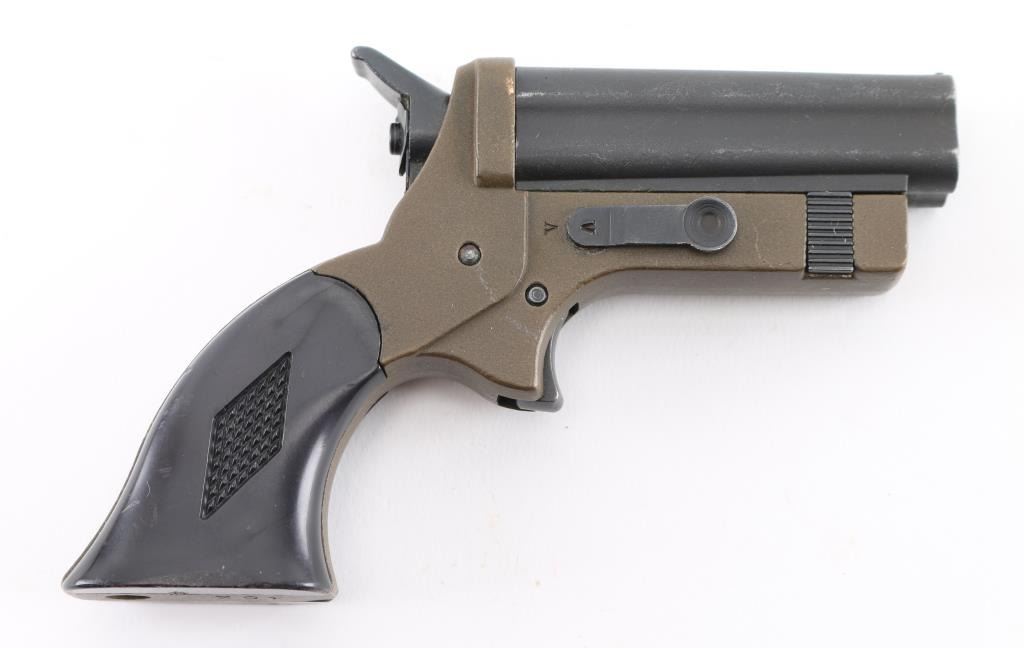 SN: 452 American made single action derringer with a rotating firing pin, brass frame and steel barrels with satin finish, approximately 2 1/2" barrels, iron sights, ammunition is loaded by unlocking the barrels and pulling them forward, serrated hammer spur, smooth trigger with a center ridge, smooth backstrap, black plastic grips that are a little loose, the safety does not appear to function as designed, finish is excellent. Includes a cardboard box with instruction sheet and parts list. **NRA Poor** Modern Firearm