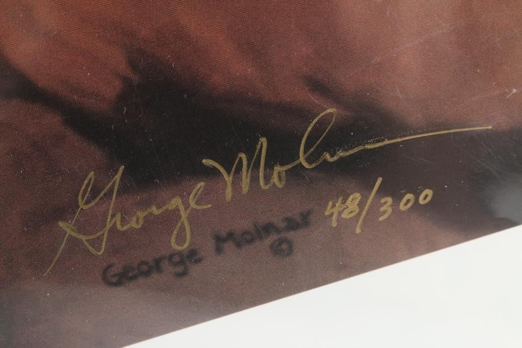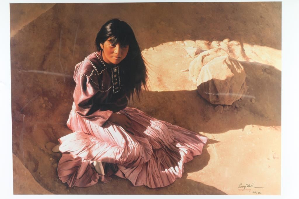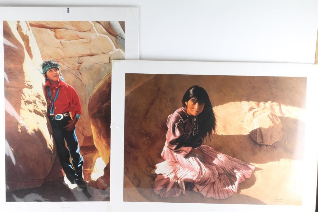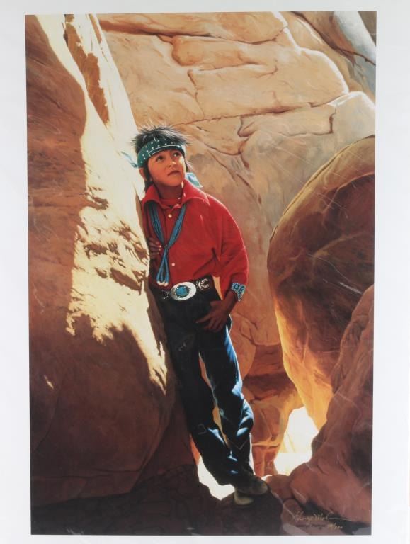 (1.) Entitled "Mellisa" depicting Native American girl this print was published in September 1998, an Signed in gold pen by the artist. Includes letter of authenticity, on back of art board. Numbered 22/300 Measures 32x24 unframed. In good condition. (1.) Entitled "Echo's Of Light", signed an numbered lower right in gold pen 48/300, Depicting boy in turquoise , in a canyon, unframed overall beautiful print , includes letter of authenticity , signed by "Molnar" Measures 32x22.5. unframed in good condition on protected art board. No cuts wrinkles or folds in paper. Bio- George Molnar Born:1953 known for Photo real Indian-cowboy genre, has several "Original Oil" pieces in Arizona museums and Texas galleries.