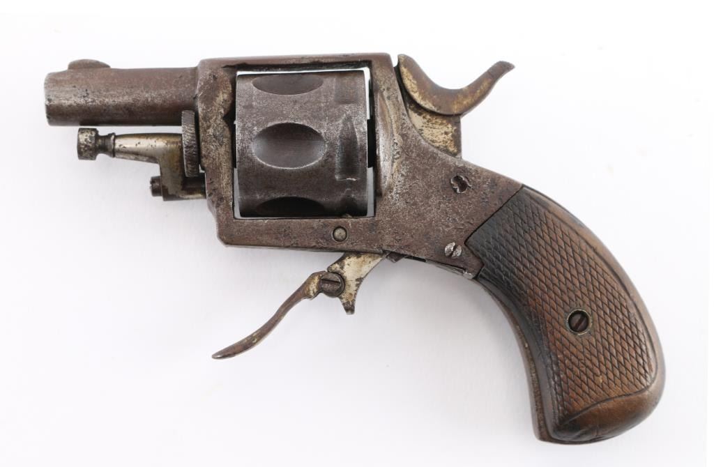 Antique small folding trigger Belgian pocket revolver in the style of the ":Bulldog. Liege proof on cylinder, Crown 'R; revolver proof on barrel, Approx, ,32 cal, 6-shot , checkered wood grips, 1 1/2" barrel, 5" overall, no finish left. Fires only single-action, you have to return the trigger to fire. Cylinder does not rotate. NRA Condition-Poor/Inoperable. Antique Firearm.