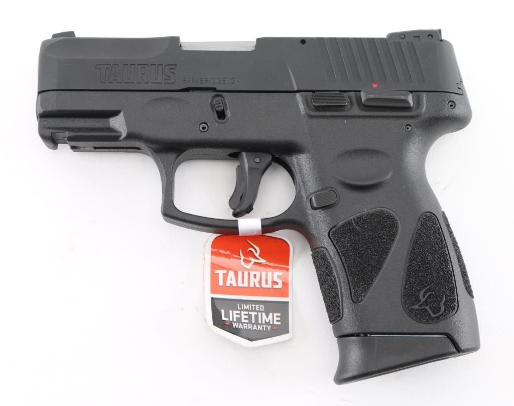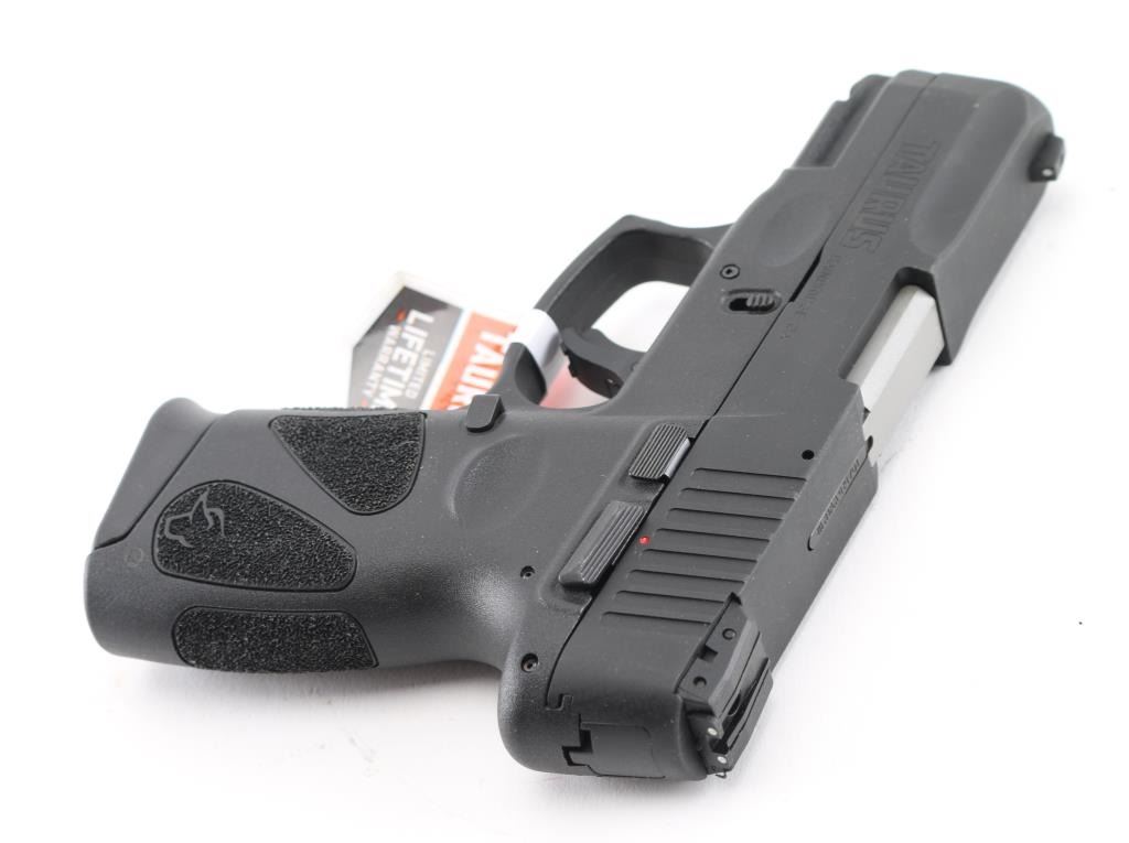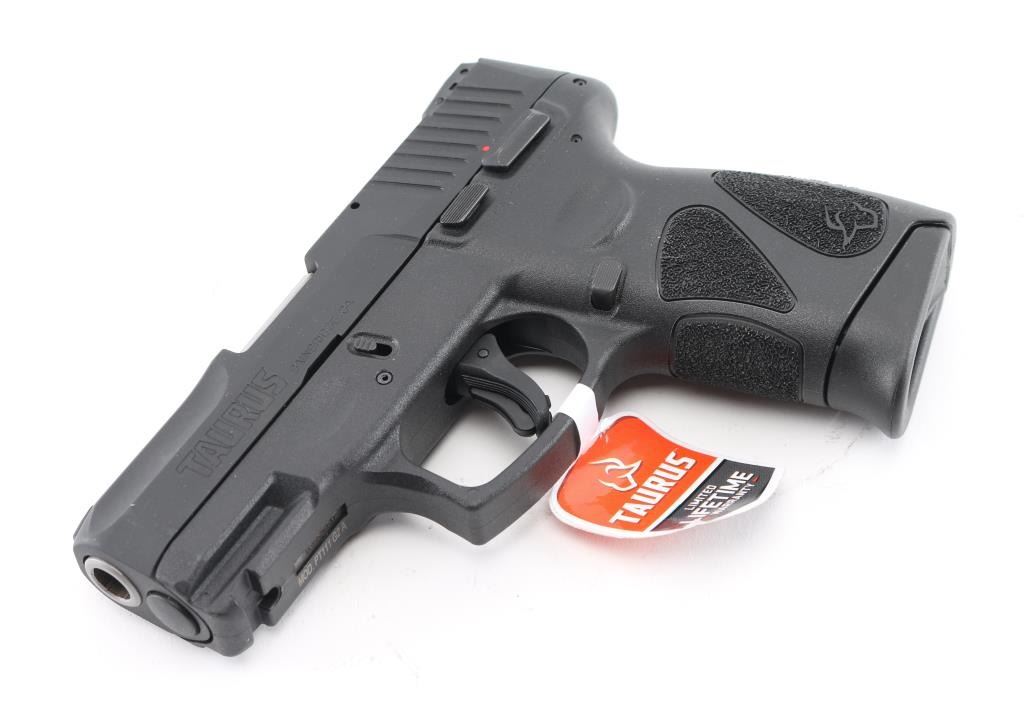 'Millennium' Brazilian made compact semiautomatic pistol. Features matte black finish, textured polymer grip frame with accessory rail, 3.2" barrel, loaded chamber indicator, 3 dot sights with adjustable rear, manual thumb safety, manual trigger safety, Taurus locking system in slide, double action only (DAO) with re-strike capability, capable of firing with magazine removed, push button magazine release. Bore is very good condition. Includes (2) 12-rd magazines with pinky extensions and factory cardboard box. Condition is NRA Excellent *** Modern Firearm ***