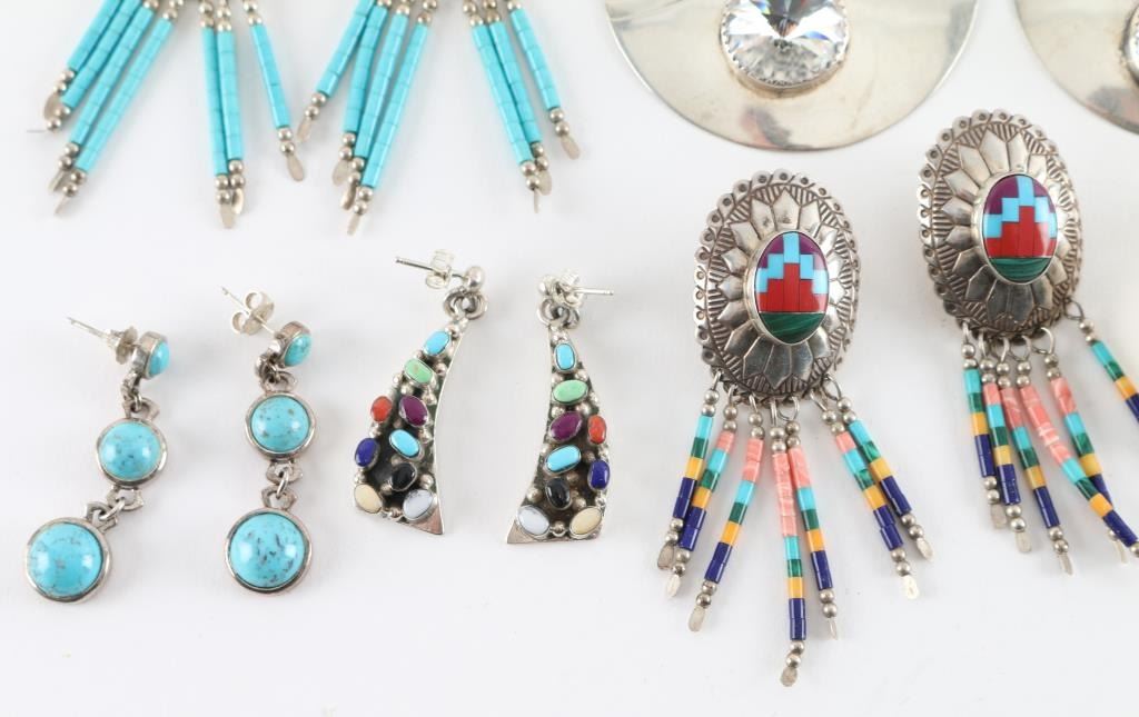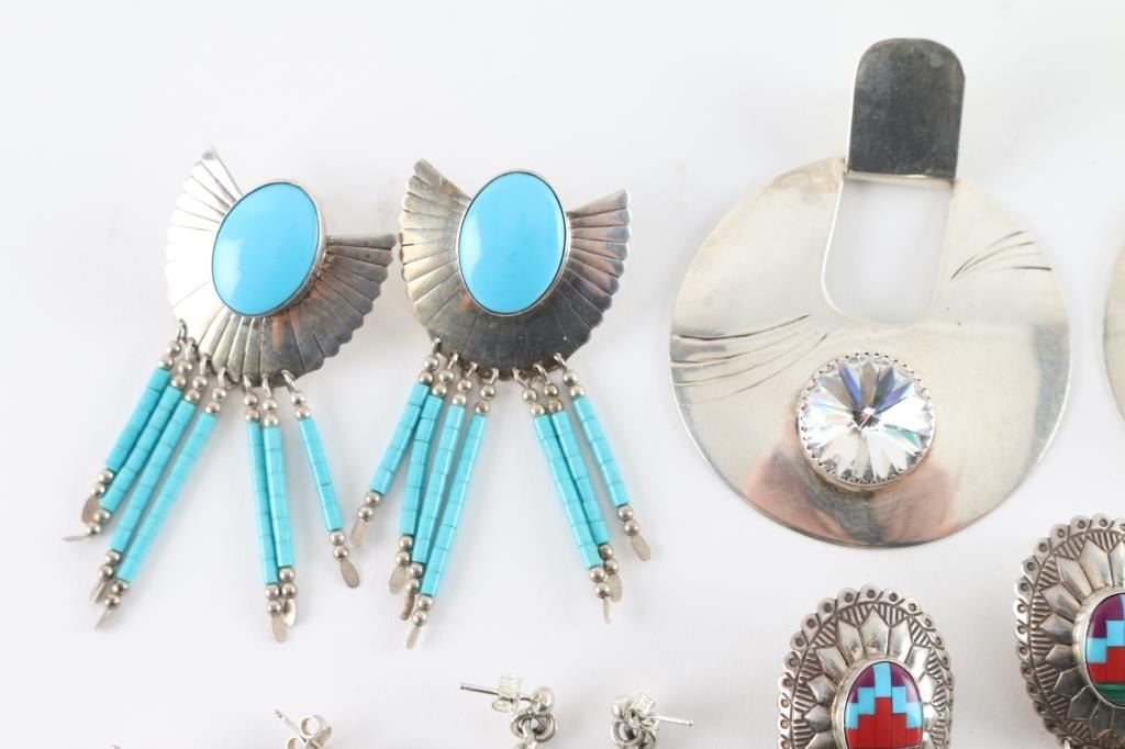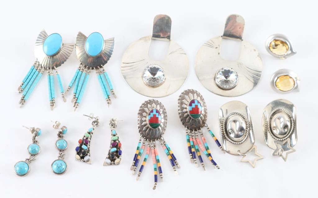 Three pairs of Zuni made sterling sliver with turquoise stones, two pairs are "Costume" one pair is a Mexican sterling cowboy hats. A pair of yellow fascited earrings , and also included is a sliver hair pin.