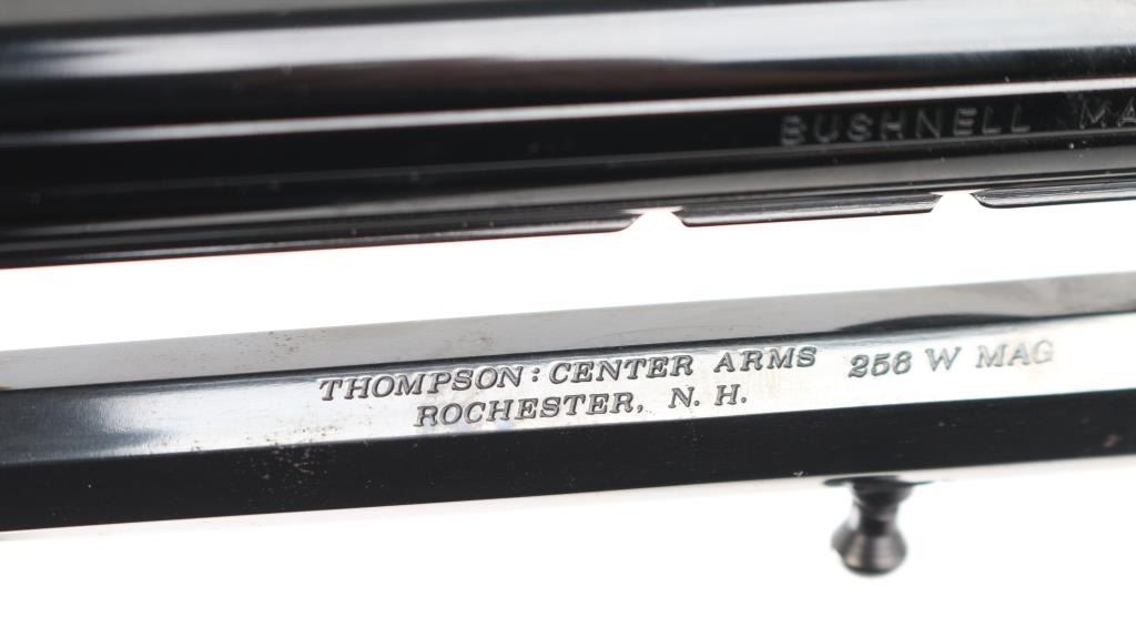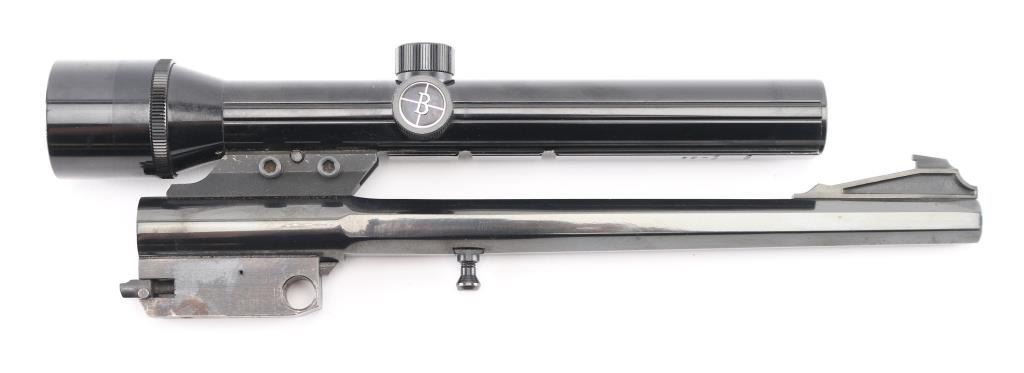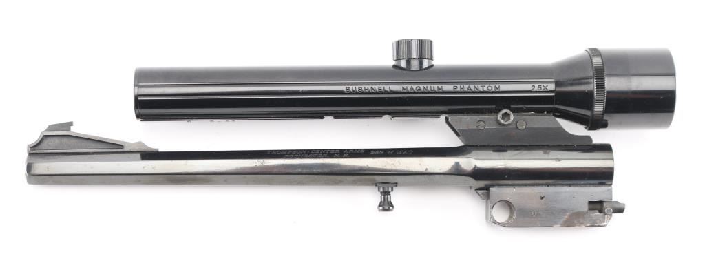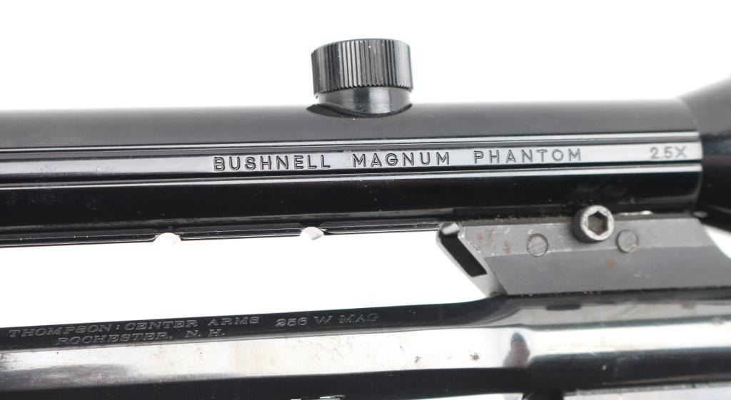 10" octagonal blue Contender barrel, .256 Win. Mag. finish is very good, bore is excellent/bright. Mounted with a Bushnell Magnum Phantom 2.5X scope, clear optics.
