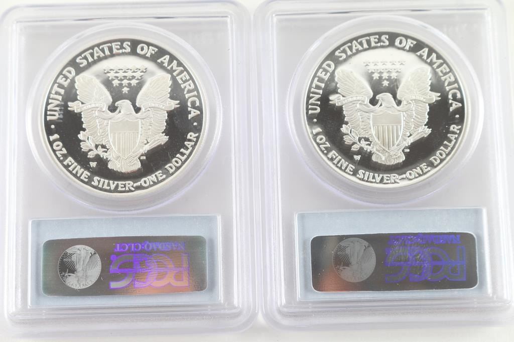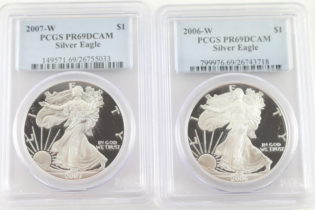 Includes 2006-W PCGS Sliver Eagle, and a 2007-W PCGS Sliver eagle. Both in mint condition in plastic protector cases.