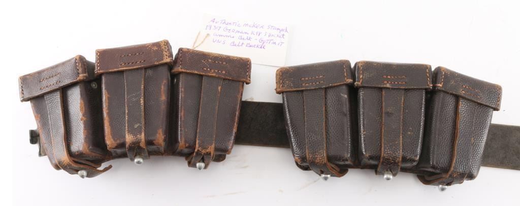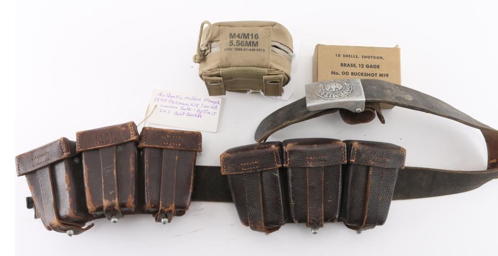 Includes authentic original German Army WWII belt buckle stamped 1937 maker marked, marked "S6" on belt loop , rip in middle section of leather , in poor condition overall with dents and scratches around ammo pouches, also included in this lot is a "Otis cleaning kit in the case made for M4 an M16" (1.) Remington Brass 12 gauge shots, in the box, never been open.