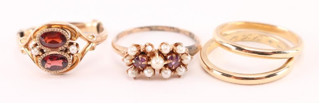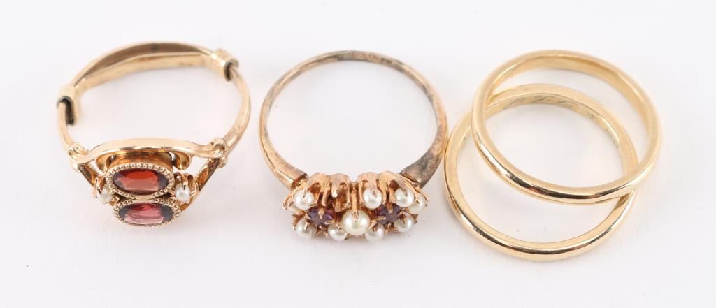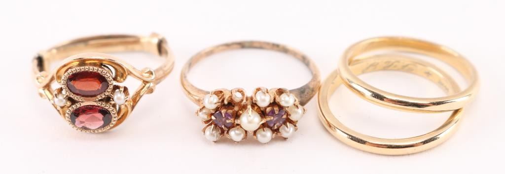 (2) 14kt yellow gold bands size 5.5 (1)10kt rose gold with freshwater pearl and amethyst (Missing one pearl) size 6 (1) Victorian 10k rose gold with two oval garnet stones size 5 with spacer