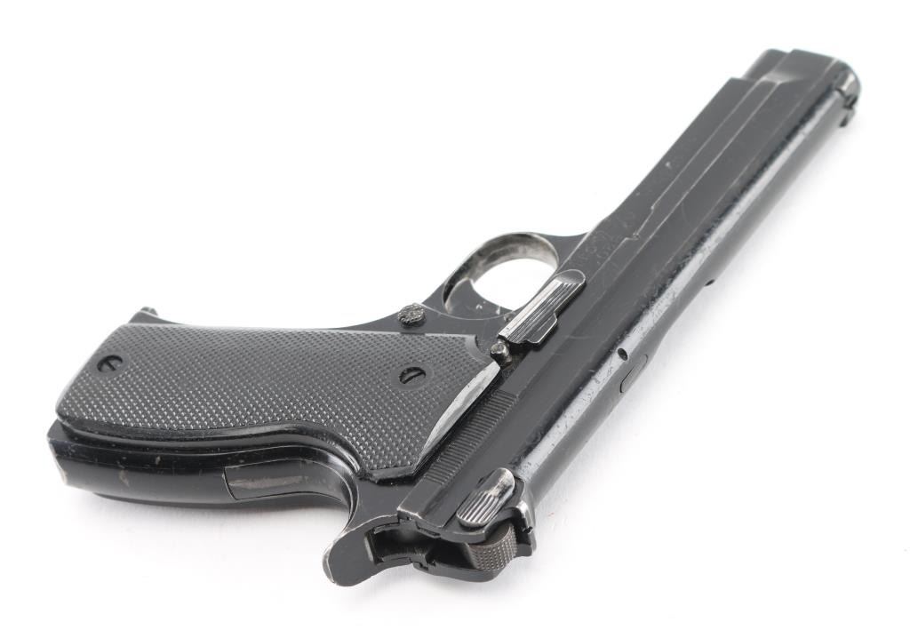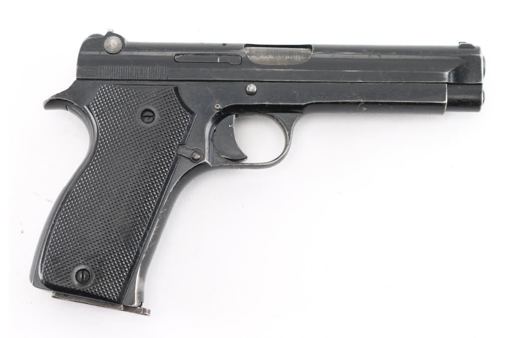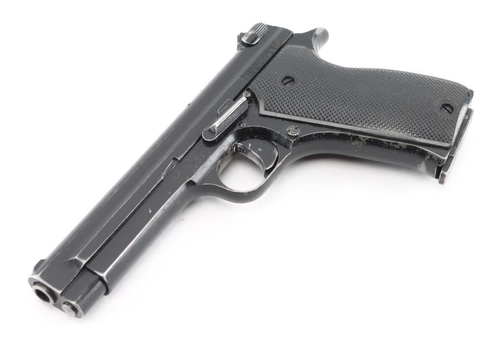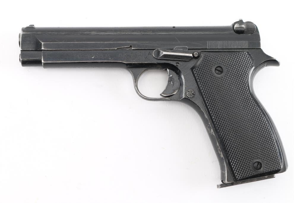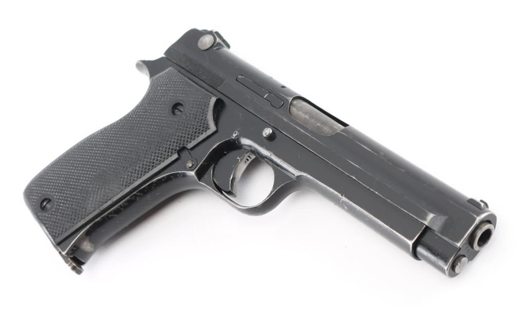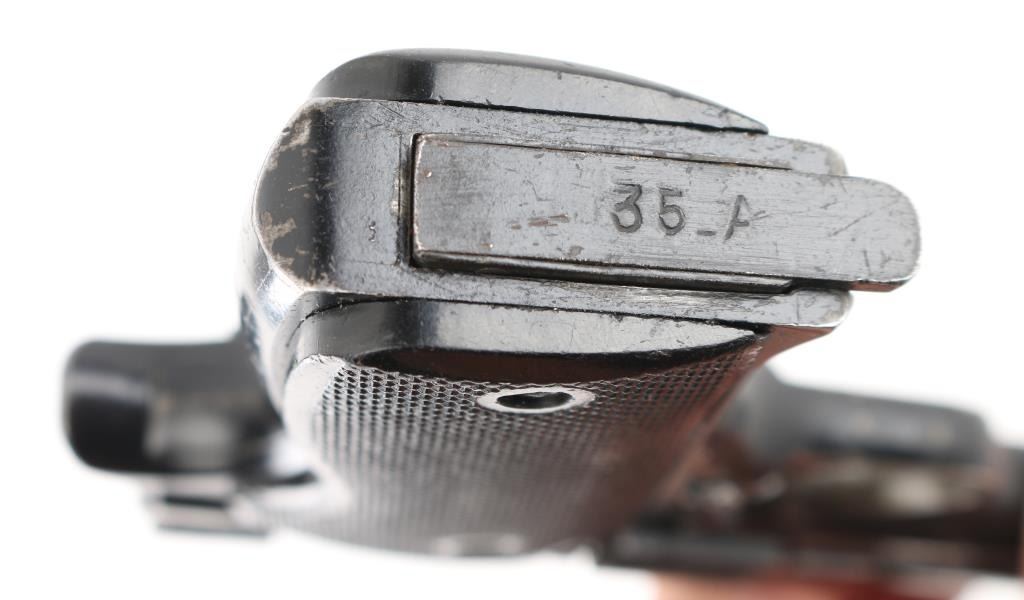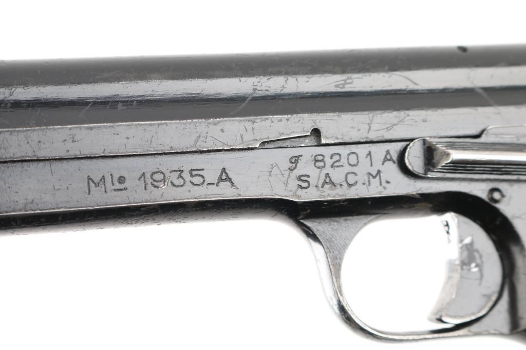 French military pistol (1937-56) 7.65x20mm Long (32 French Long), 4.3 inch barrel with a good, bright bore with strong rifling and scattered light pitting mostly in the grooves, ring hammer, fixed sights. This is the French model 1935A manufactured by SACM during the French Indochina War era that is not import marked, possibly a Vietnam war bring back. The original black enamel finish shows holstering and handling wear with numerous scratches and nicks, wearing smooth on the grip straps. The synthetic black checkered grips have a tight fit without any cracks or chips. One original 8 round magazine is included marked 35-A on the bottom. It is in fine mechanical shape. NRA Condition-Good. C&R Firearm.