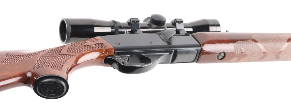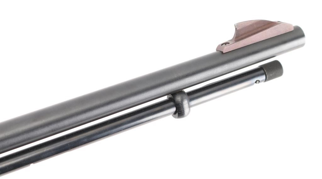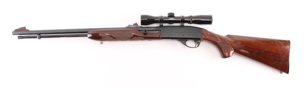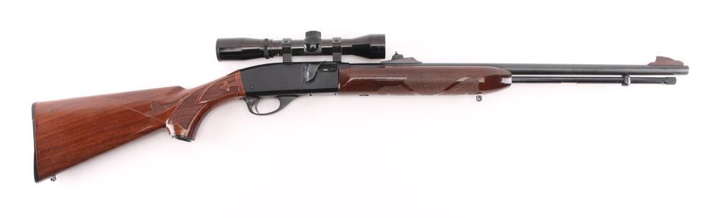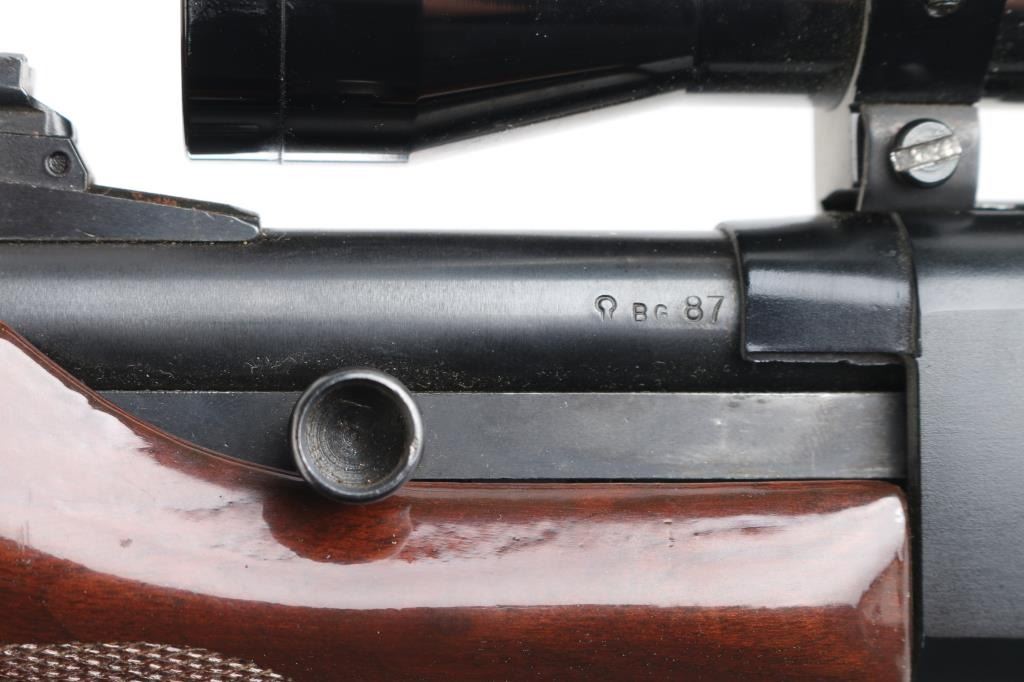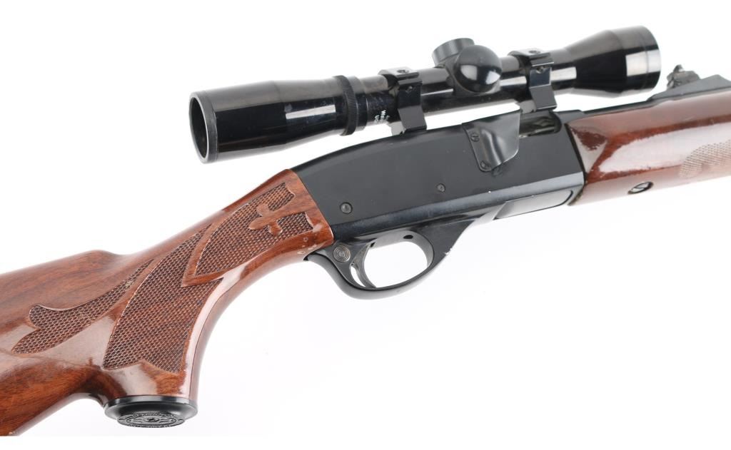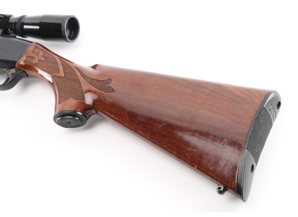 'Speedmaster' American made, blow-back operated semi-automatic rifle with a full-length feed tube, charging handle is on the left, ejection port is on the right. a brass deflector has been installed on the receiver, approximately 21 1/2" barrel, bore is bright, blade front sight, adjustable open notch rear sight, smooth trigger, checkered forearm stock, buttstock has checkering on the wrist and the pistol grip, the buttstock has an approximately 5" long scratch on the right side and a small chip on the left, Bushnell Sharpshooter scope. **NRA Good** Modern Firearm