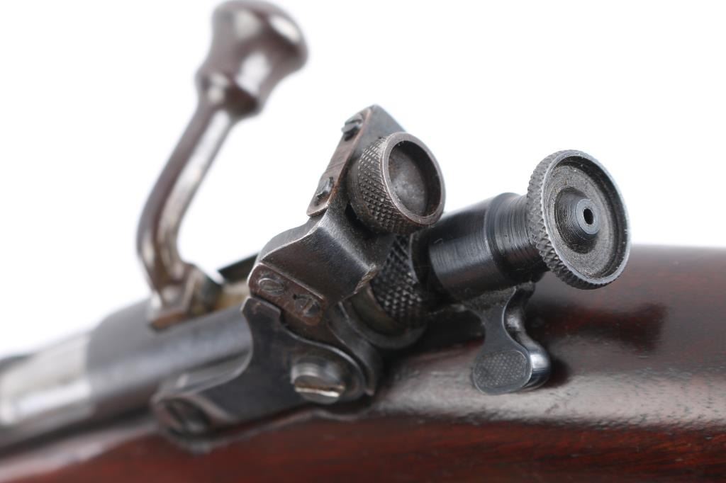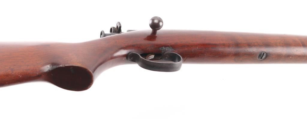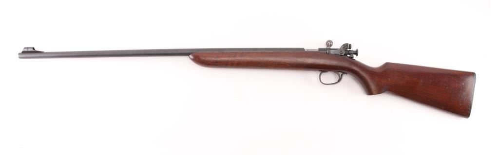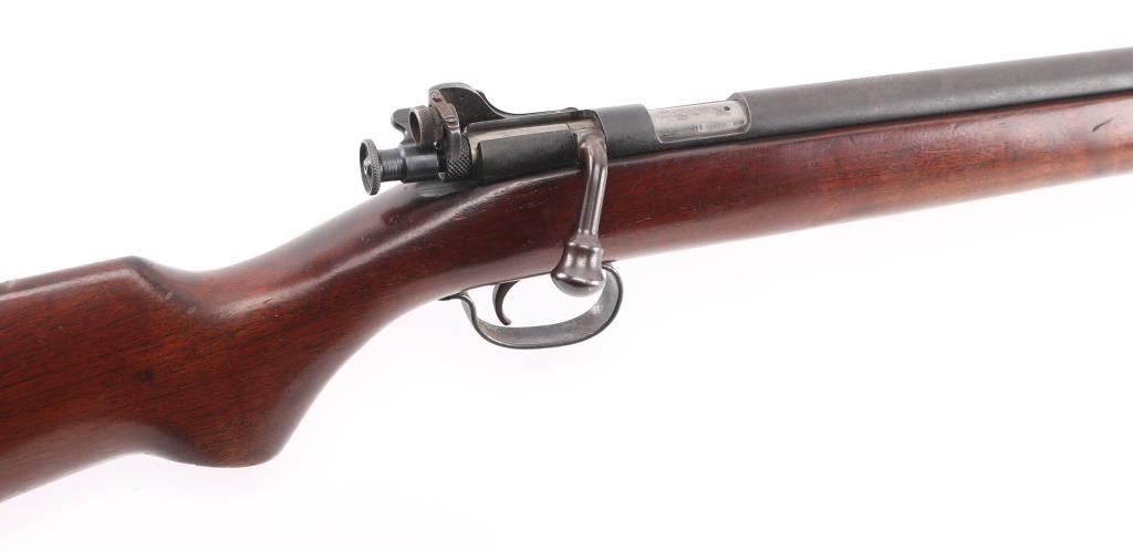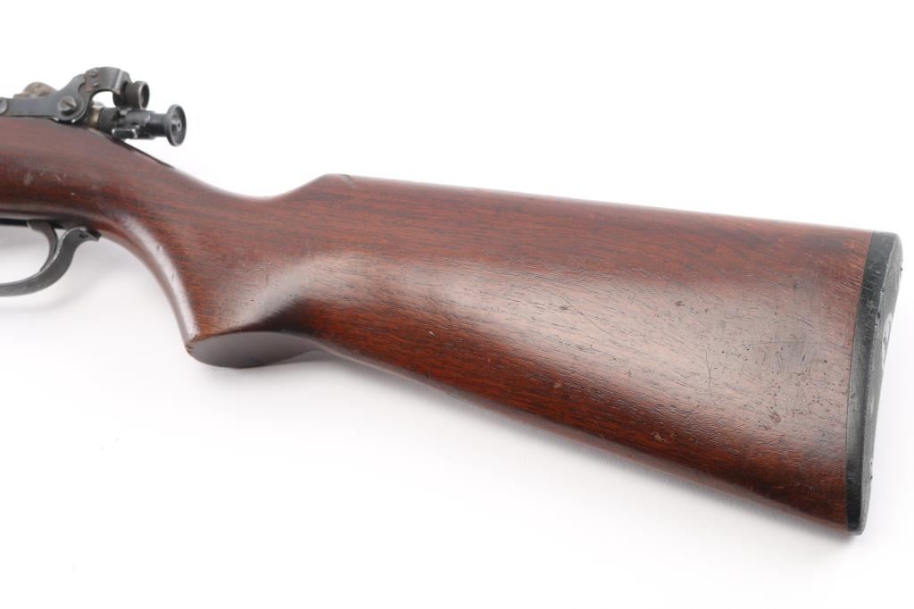 'The Targetmaster' Single shot bolt action sporting rifle chambered in .22 caliber, circa 1930's. Features a blued finish, 27" tapered barrel, hooded post front sight, rear adjustable peep sight, contoured bolt handle, winged safety, straight grain pistol grip walnut shoulder stock with Remington checkered hard rubber buttplate. Finish has moved to an dull blue with light muzzle wear. Wood stock is sound with minor scratches/rubs. Action is strong and bore is excellent. Condition is good to very good. C&R Firearm.