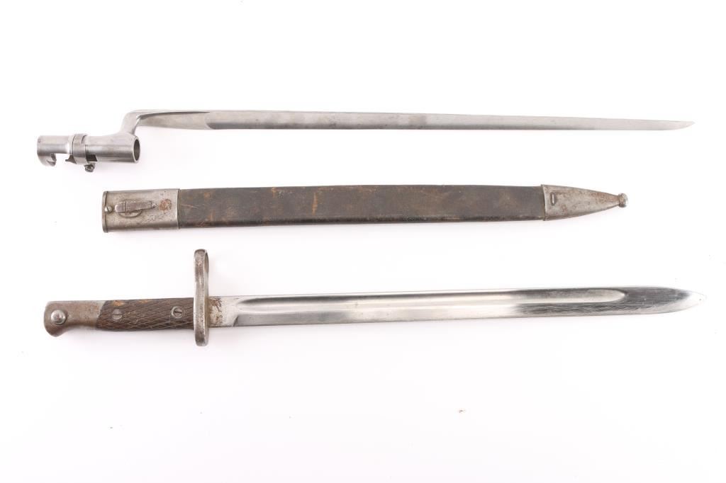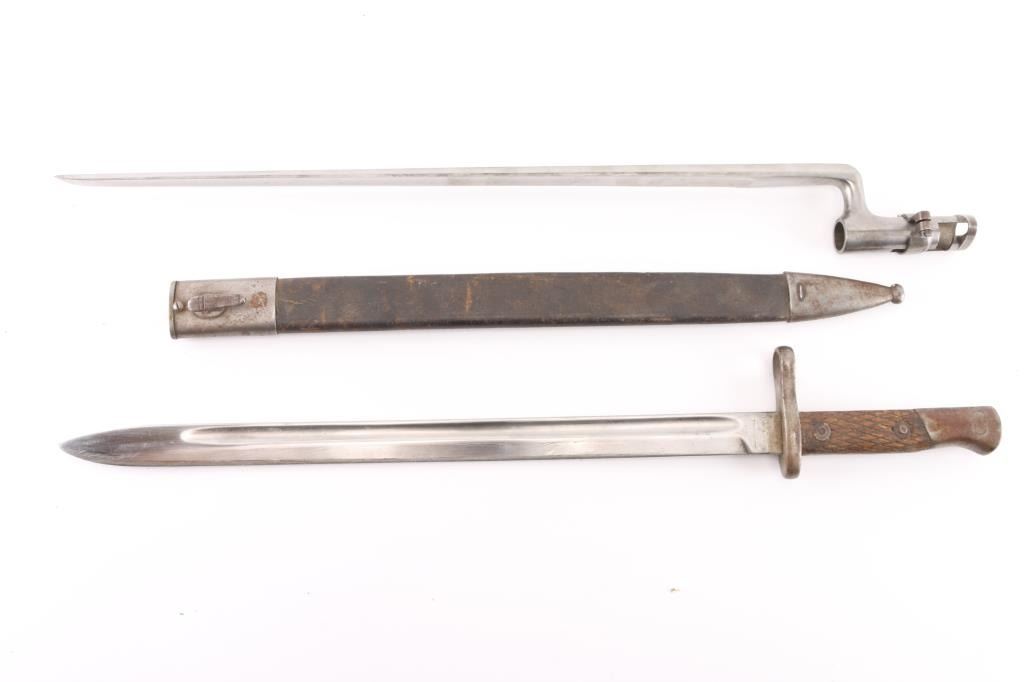 1) Spanish M1913 bayonet for use with the M1916 & M1943 short rifles. 15 1/2" blade, leather scabbard with metal fittings, Blade has been sharpened, bayonet does not seat all the way in scabbard due to shrinkage. 2) U.S. M1873 Springfield 'Trapdoor' bayonet, 18" blade, bayonet has a nickel refinish covering the U.S. on the ricasso.