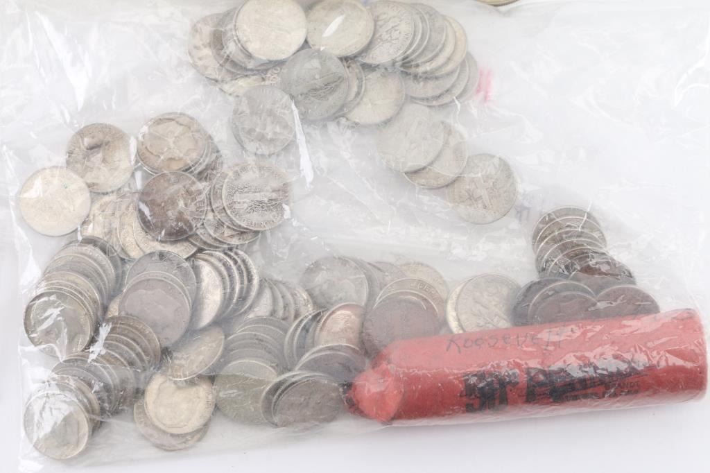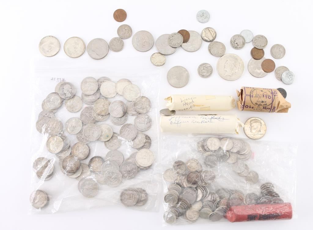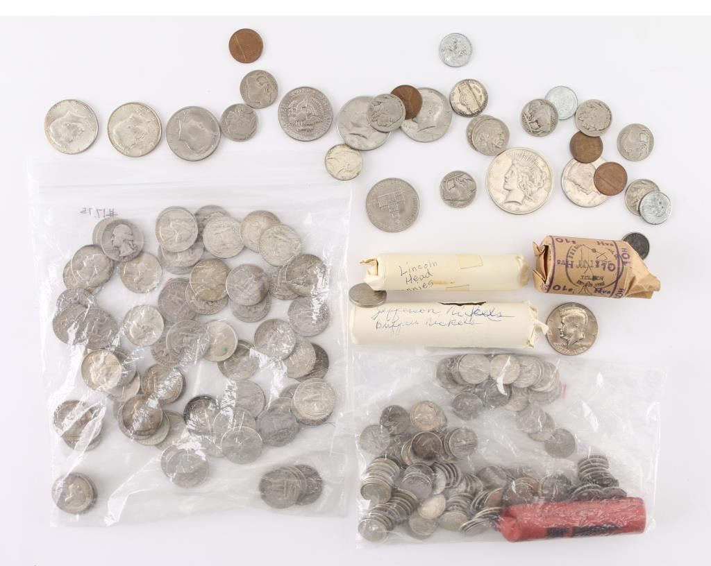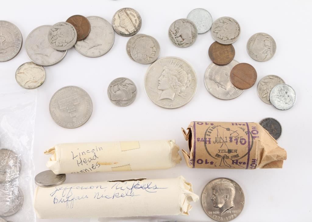 Buffalo Nickels 7) 1935 2) 1936 2) 1937 1)1934 (6) Kennedy Half Dollar (1) 1934 & (2) 1943 Steel Penny (4) Pennys 1975,1965,1919,1942 $10 Roll of Kennedy Half Dollars 125 Dimes (1) Roll of Dimes (70) Quarters (1) Roll of Jefferson and Buffalo nickels various dates (1) Roll of Lincoln Pennys 1912-1964 (1) 1925 Peace dollar (3) Buffalo Nickels