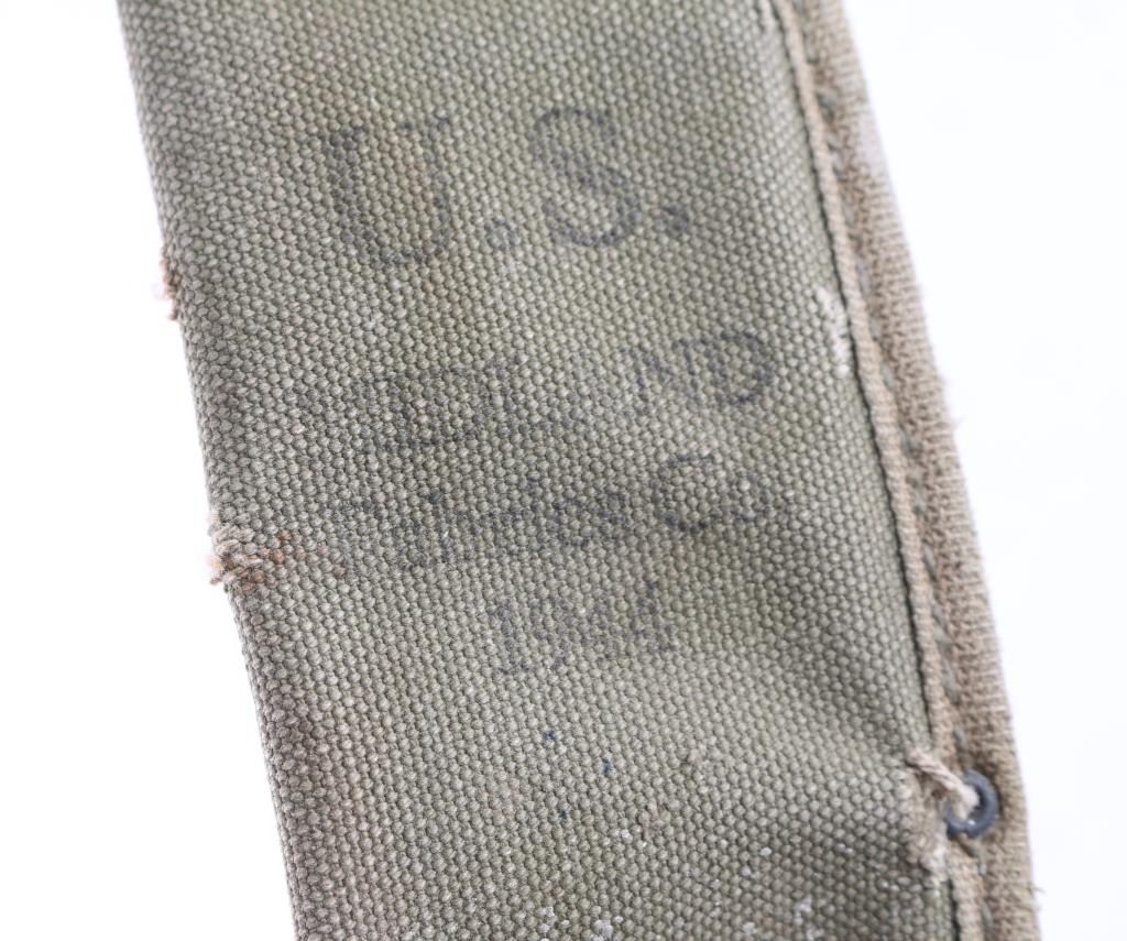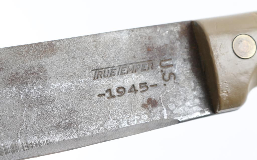 'True Temper' WW2 U.S. military issued Machete. 17.5" blade (Blade has been sharpened) OD plastic grips. Blade marked 'True Temper U.S. 1945'. OD canvass sheath marked 'Midland fabrics Co. U.S. 1944. Blade has some surface rust/pitting. Sheath is sound, one side has some white paint spatter.