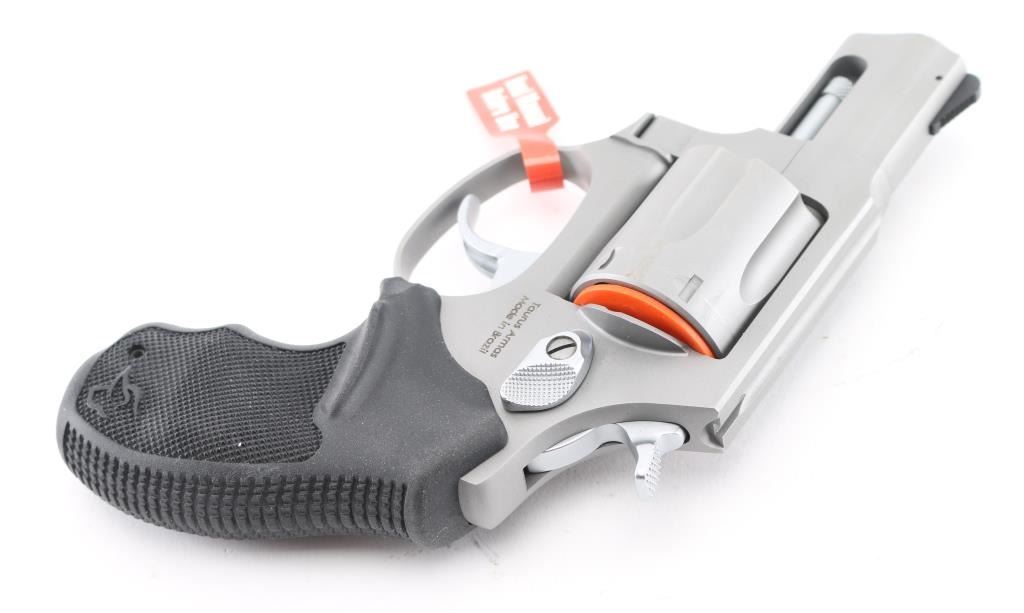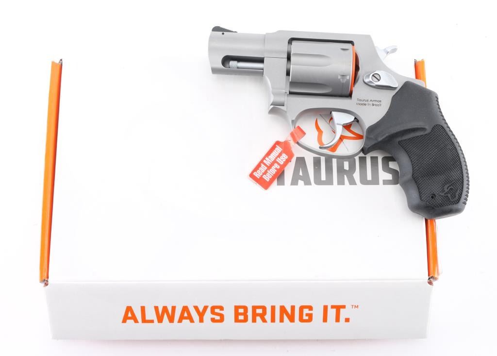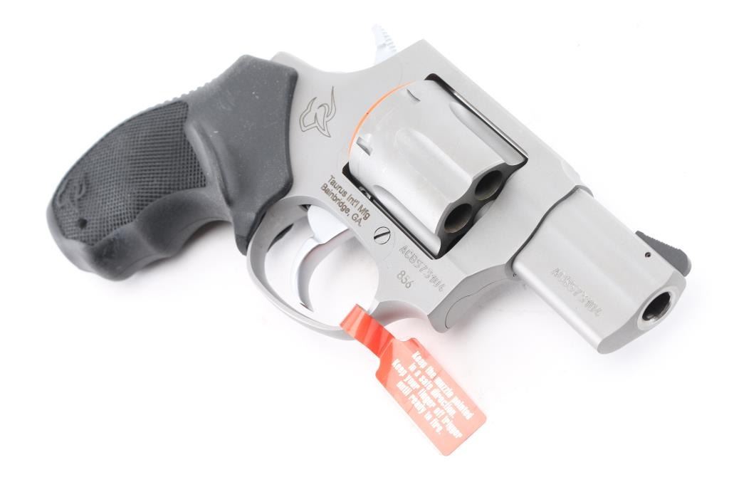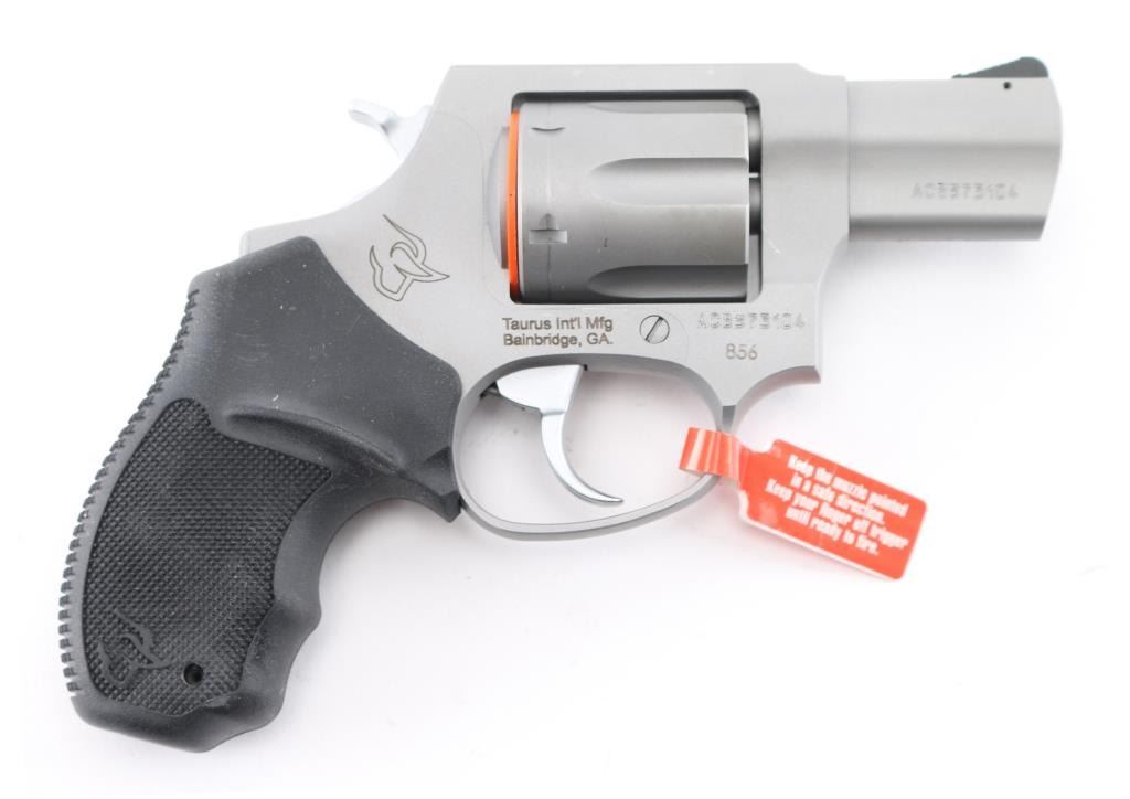 Brazilian 6 shot, compact revolver chambered for 38 special, imported by Taurus Int'l Mfg, Bainbridge, GA. It has A matte silver alloy finish, 2" barrel, fluted cylinder, fixed, serrated front sight, notch rear sight, smooth trigger, knurled hammer spur and black, rubber, finger groove pebbled grips. Bore is bright. Cylinders are clean. Metal finish looks very good. Comes with original cardboard box, gun manual and gun lock Grips are fine. Condition is NRA Excellent *Modern Firearm*