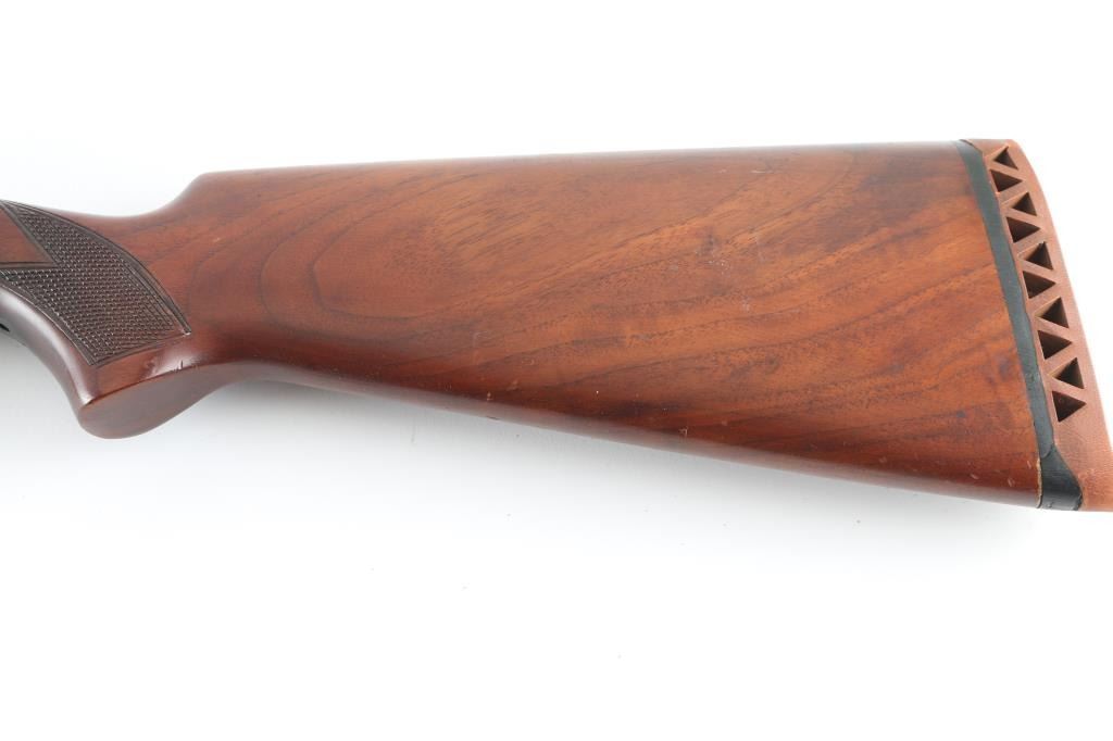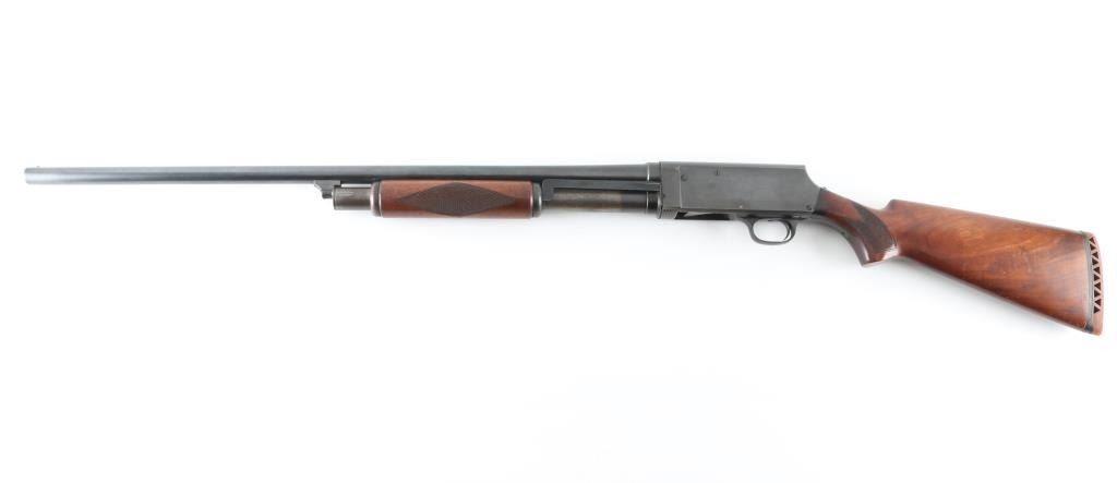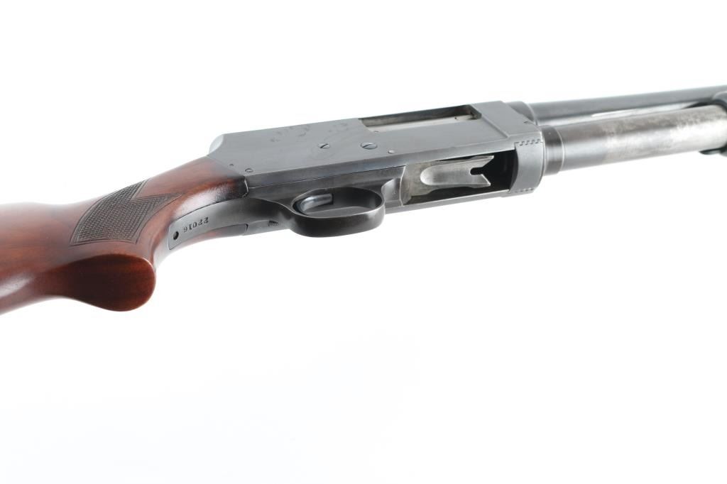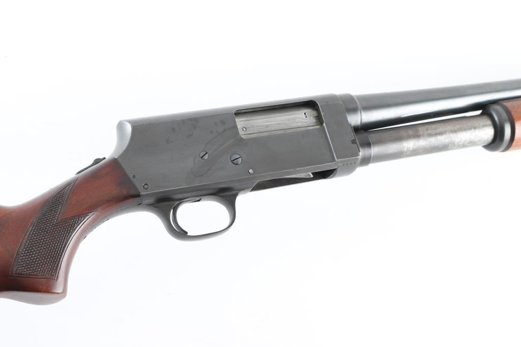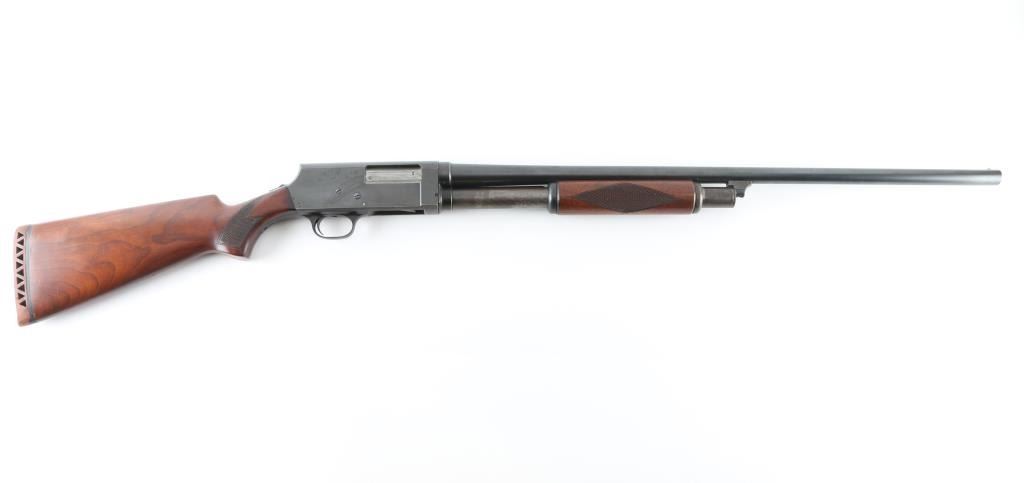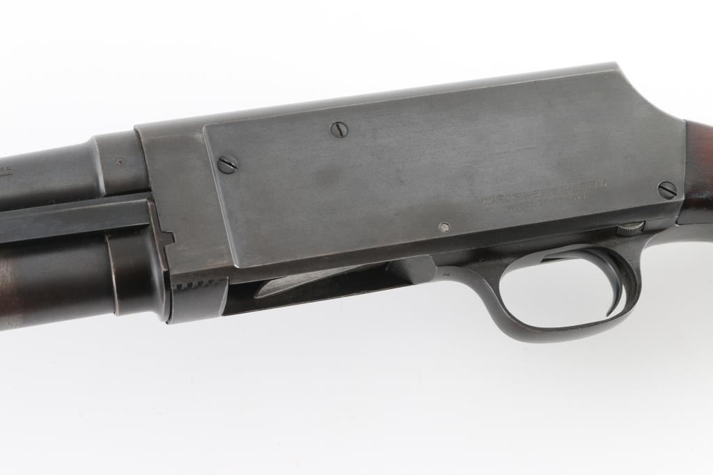 SN: 22016 Vintage slide-action repeating shotgun chambered for 16 gauge shells. Browning patent made by Stevens foe Montgomery Ward. Features a blued finish, 28" barrel with a bead front sight, 2 3?4" chamber, half length tube magazine, steel hump-back receiver, smooth trigger, sliding safety inside trigger guard, checkered walnut slide handle and pistol grip shoulder stock with red vented rubber recoil pad. Bore is excellent/bright. Metal finish looks good with some scuffs on the receiver, blue has dulled but is mostly all there. Action is smooth/tight. Wood is very good. NRA Condition-Very Good. C&R Firearm