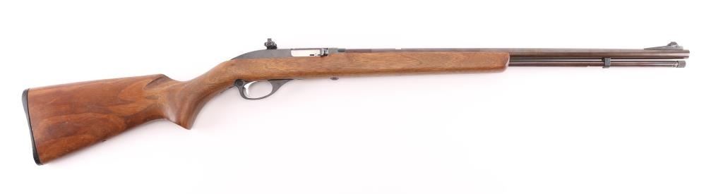 American made rifle, semi-automatic, tube fed, black finish and brown patina, approximately 22" barrel, bore is bright, white dot blade front sight, fully adjustable peep rear sight mounted on the receiver, full length feed tube, patina on the barrel and feed tube is smooth and consistent, finish on receiver is rubbed and scratched, serrated trigger, stock is scratched and chipped, hard plastic Marlin buttplate. **NRA Good** Modern Firearm C&R Elibible