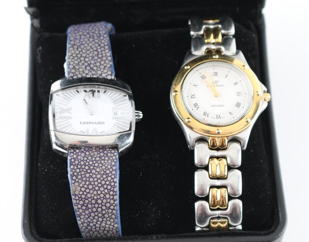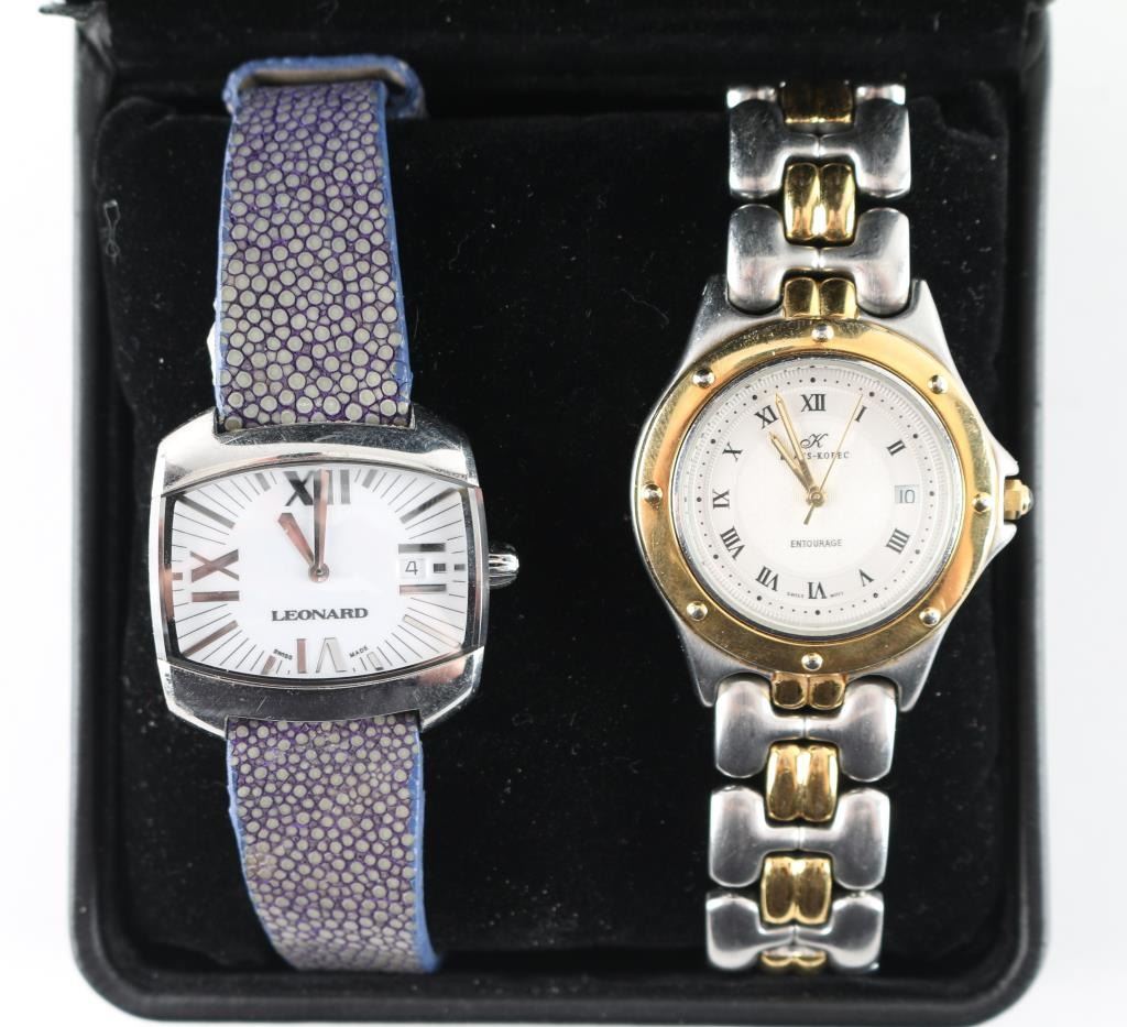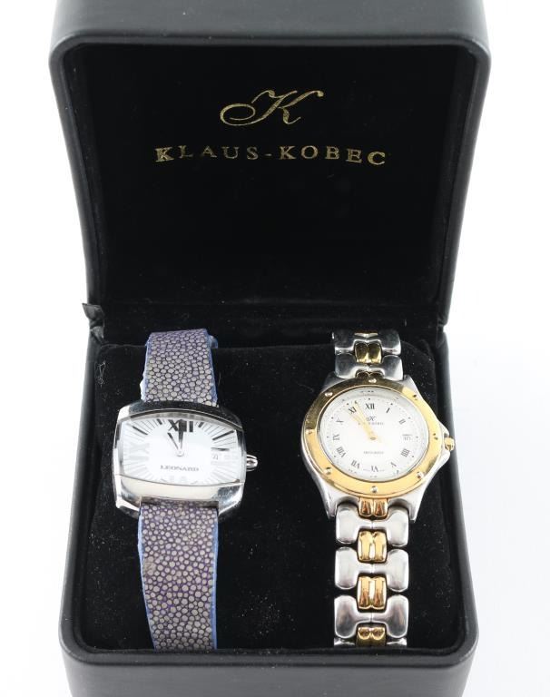 By "Klaus-Kobec" in original case, dated 1968. Featuring gold an sliver stainless steel band, Swiss movement in working condition. Shows signs of use with scratches on bottom of face. Includes extra link for band. In good condition. Also Included in this lot is a very nice Leonard "Swiss Movement" wrist watch with blue sting ray band, with white face. In good condition.