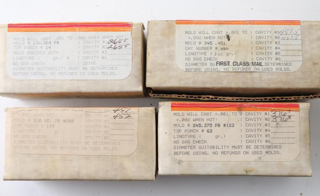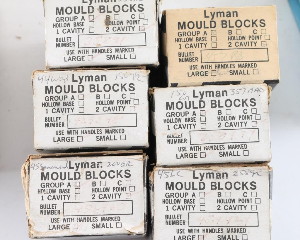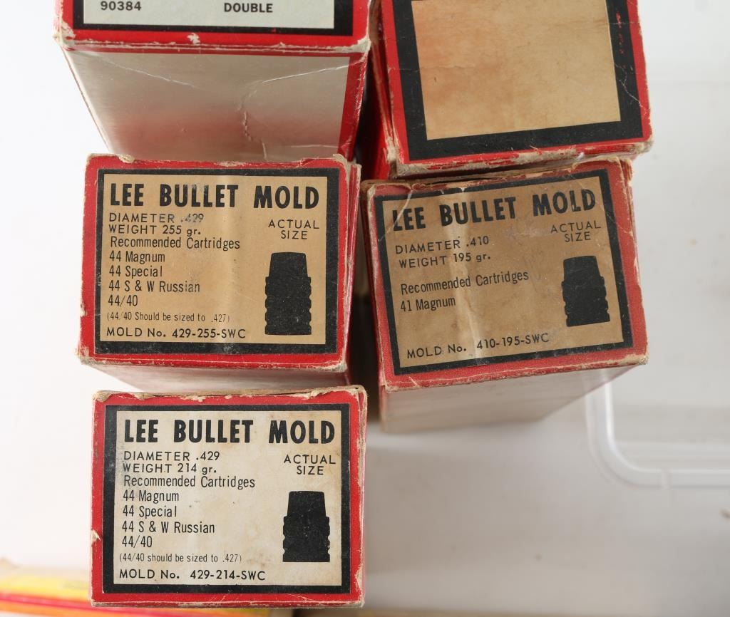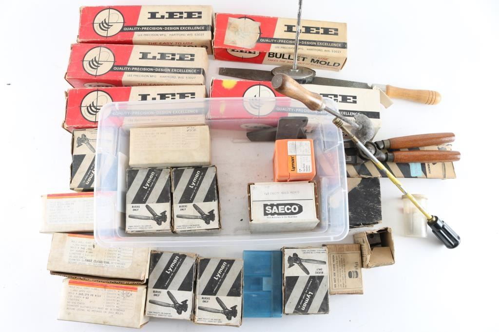 Northeast Industrial double cavity bullet mould #120.264 PB, hand labeled 265.5, blocks only. Northeast Industrial double cavity bullet mould #245.375 PB #123, hand labeled 376.7 and 376.8 diameters, blocks only. Northeast Industrial double cavity bullet mould #310.451 PB #208, hand labeled 452 diameters, blocks only. NEI/Tooldyne double cavity bullet moulds #345 .451, hand labeled 451.5 diameters. Saeco double cavity bullet mould #62413, hand labeled #413, 41 cal, 210 gr, blocks only. Lyman double cavity mould blocks, hand labeled 357 mag, includes literature "Bullet Making Guide." Lyman double cavity mould blocks, hand labeled 38 wad. Lyman double cavity mould blocks, hand labeled 45LC 255 gr, includes literature "Bullet Making Guide." Lyman double cavity mould blocks, hand labeled (possibly) 45 small wad, 200 gr. Lyman double cavity mould blocks, hand labeled 44 wad, 150 gr. Lyman double cavity mould blocks, hand labeled 457 RB. Lyman double cavity pistol mould blocks, #2660651, labeled 45 cal, FN, GC, 325 grain. One pair Lyman bullet mould handles. Lee single cavity bullet mould #456-220-1R. Lee single cavity bullet mould #429-255-SWC, .429 diameter. Lee single cavity bullet mould #429-214-SWC, .429 diameter. Lee single cavity bullet mould #410-195-SWC, .410 diameter. Lee double cavity bullet mould #456-220-1R, .456 diameter. Ohaus single cavity bullet mould, .457 diameter, .45 cal, 405 grain, flat nose, plain base, blocks only. Thompson Center Arms single cavity bullet mould, Maxi_Ball, .45 cal, 220 gr, blocks only. Thompson Center Arms Hawken & Patriot single cavity round ball mould, .45 cal, .440", 128 gr. One NEI bullet mould top plate. One unlabeled bullet mould top plate. One Midway cleaning jag set in plastic container, nine jags. One lead pouring tool. One tempoint thermometer, range: 200-1000 degrees. One 10" file with wood handle. One Parker-Hale pistol cleaning rod with jag. One unknown screw in a plastic container. One 2 1/4" cleaning rod extension.