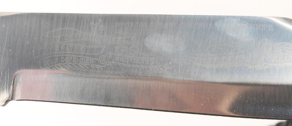 Made by "White Tail Cutlery"Includes black leather carved sheath, with engraved blade. Brass guard construction with stained colored wood handle with minor wood loss to handle. Blade is marked "Pakistan" overall good condition.
