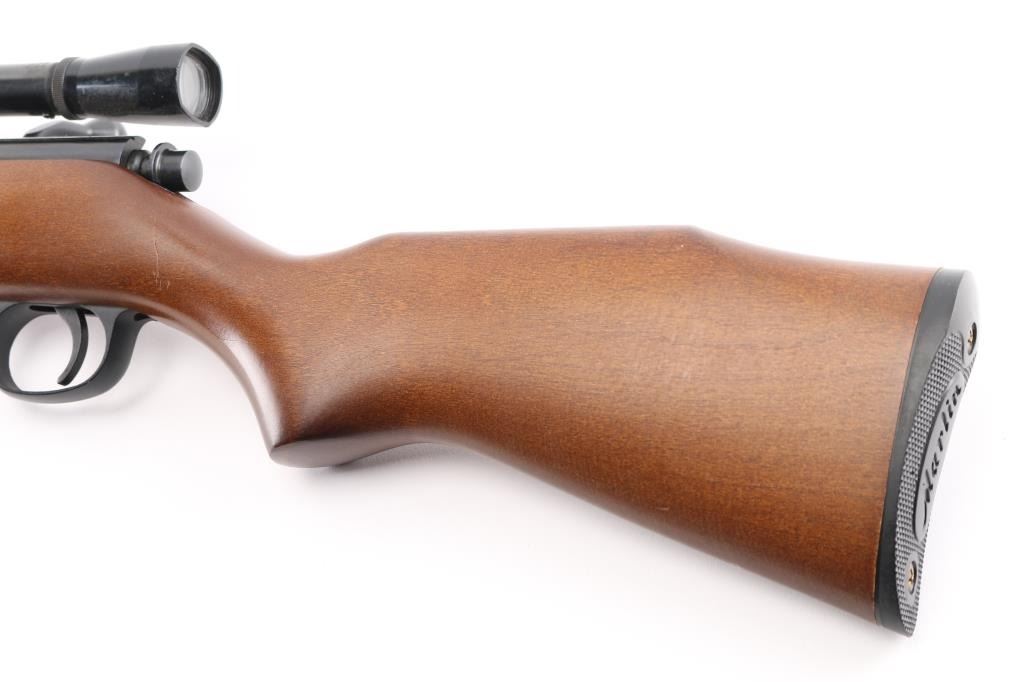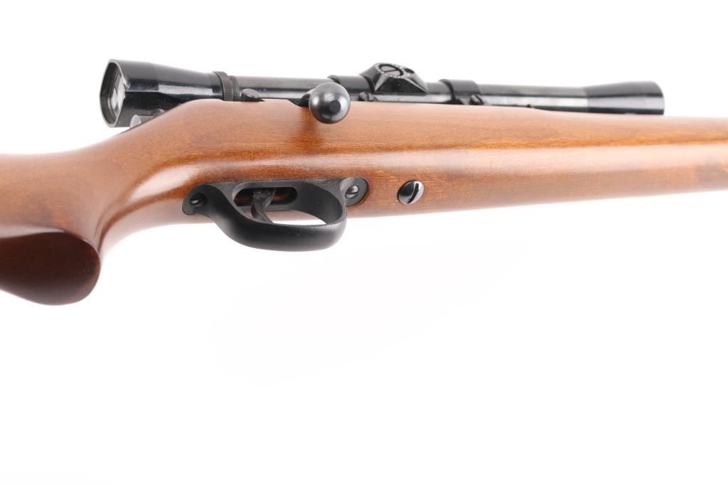 American made bolt action rifle,Lil Buckaroo single shot, blued finish, approximately 16 1/2" barrel, bore is bright, blade on a serrated ramp front sight, buckhorn rear sight, Weaver Marksman M3/4"-4XW scope, scope is clear and bright, ridged ring around the bolt handle knob, serrated trigger, small chip on the bottom of the buttstock, light scratches in the stock. **NRA Excellent** Modern Firearm