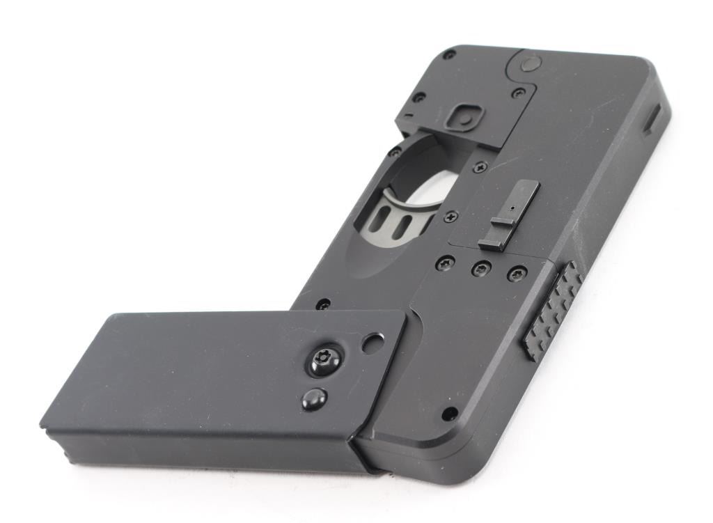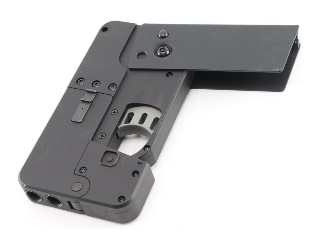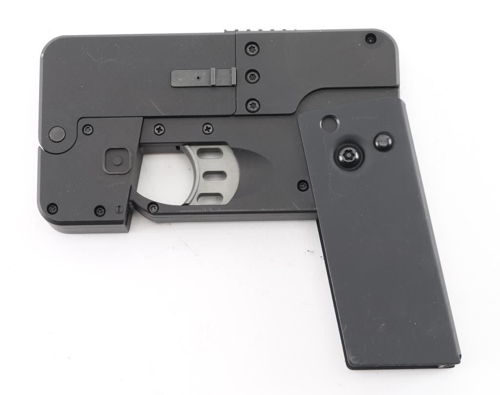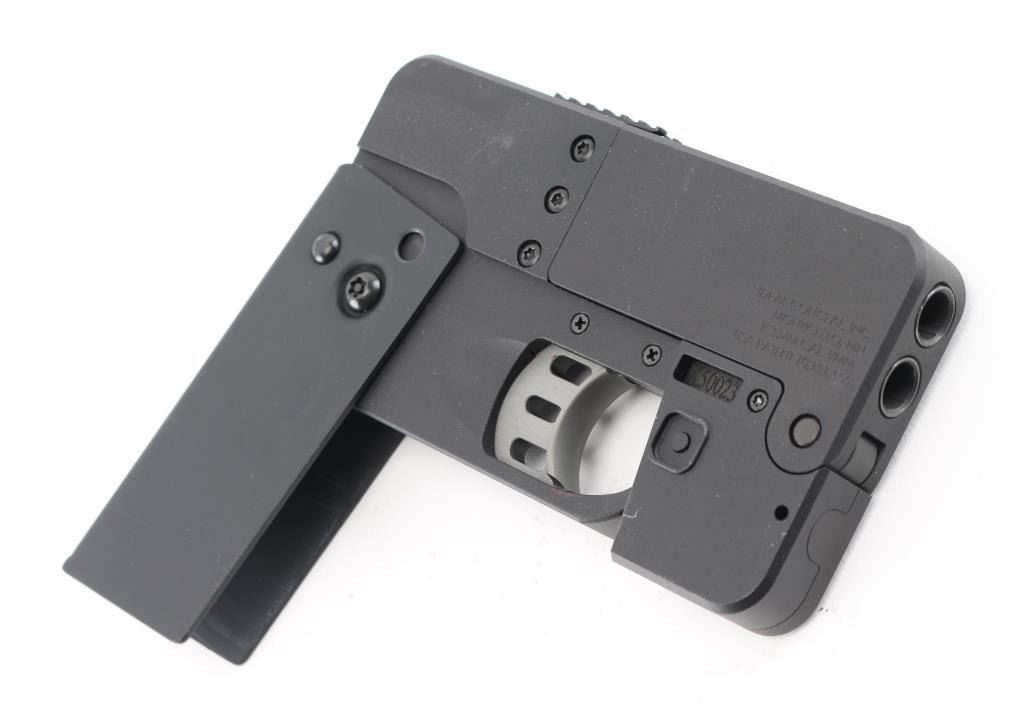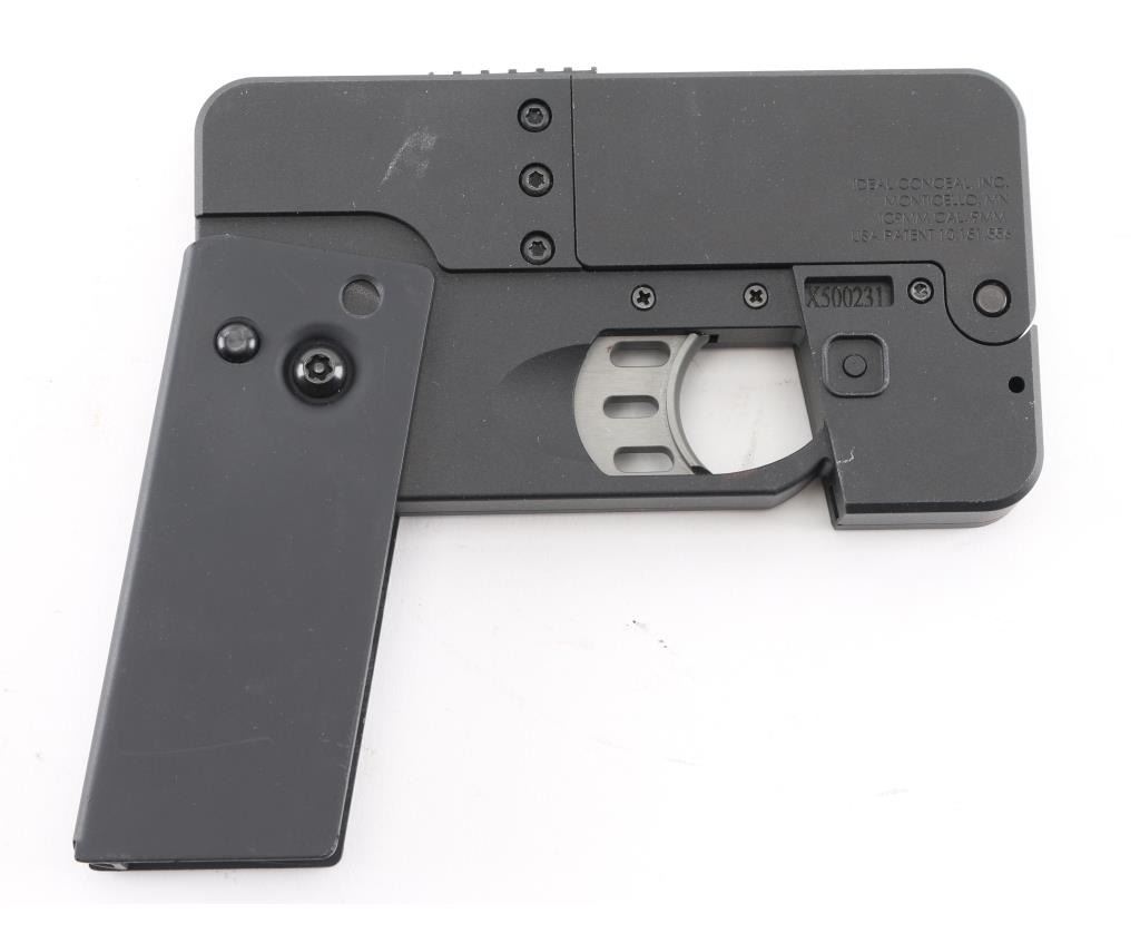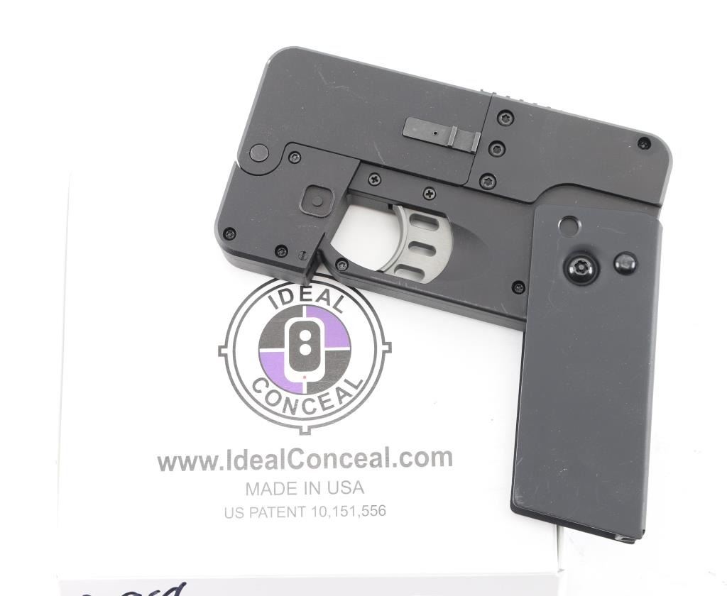 The Ideal Conceal pistol IC9MM is a derringer-style handgun containing two barrels, chambered for 9mm. Around the same size as a Samsung Galaxy S7 cellular phone, it has a handle that collapses to give it the appearance of a mobile phone when not in use. One barrel fires with the press of the trigger. The firearm has an optional laser device not included. Comes with original cardboard box, manual and trigger lock. Gun is new. Condition is NRA Excellent. Modern Firearm
