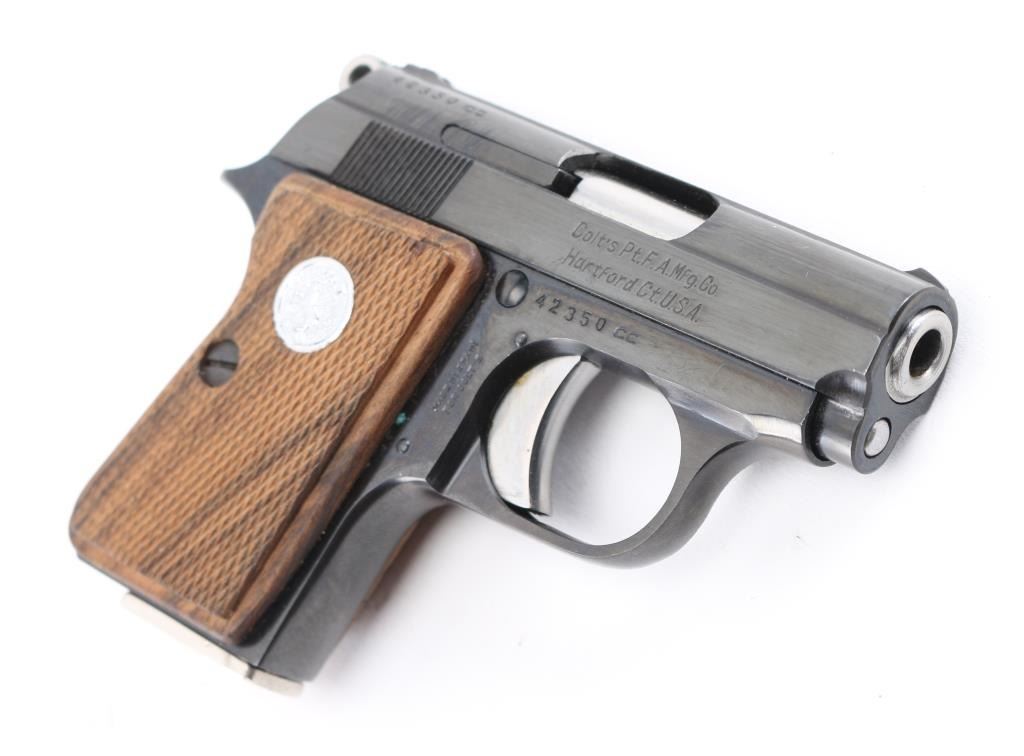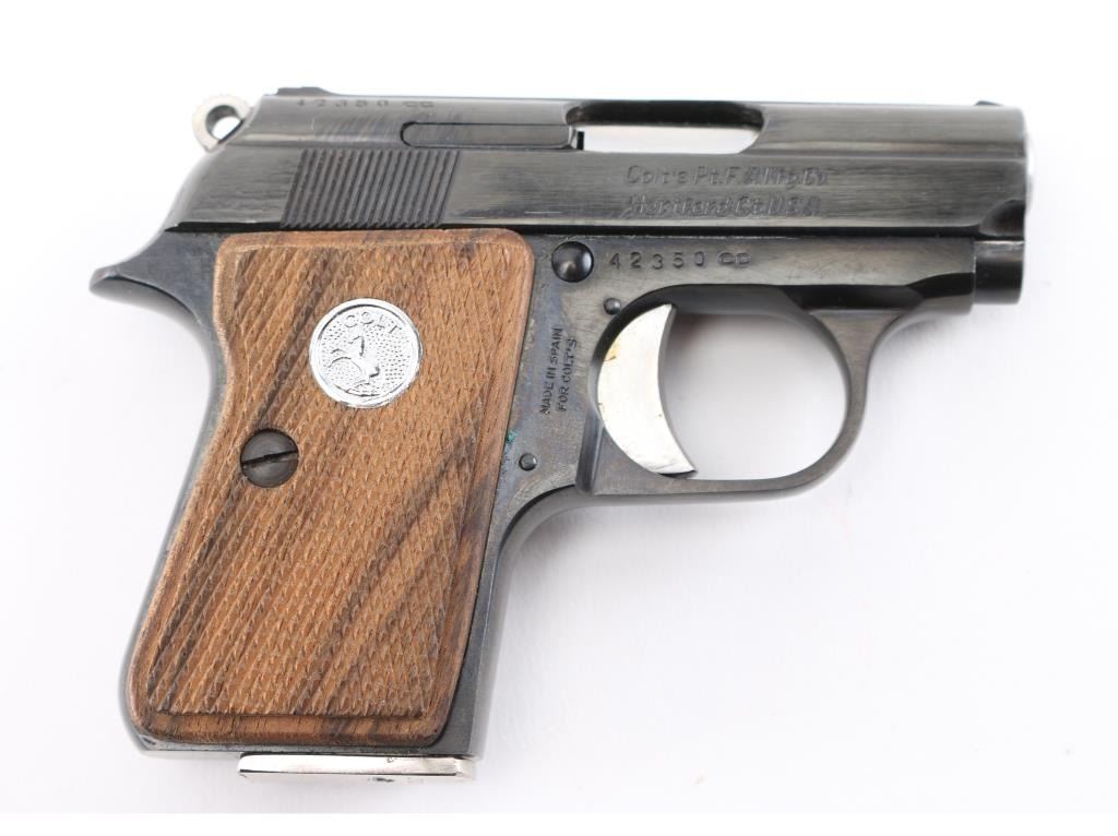 Produced in Spain by ASTRA for COLT, pre-1968, pocket size DA/SA semi automatic pistol chambered in .25 Auto. Features a blue finish, 2.25" barrel, fixed sights, smooth trigger, serrated round hammer spur, push button magazine release, factory 6 round magazine, manual safety/slide catch and Colt medallion checkered wood grips. Gun is new. Comes with original cardboard box and (1) six round magazine. Condition is NRA Excellent C&R eligible firearm